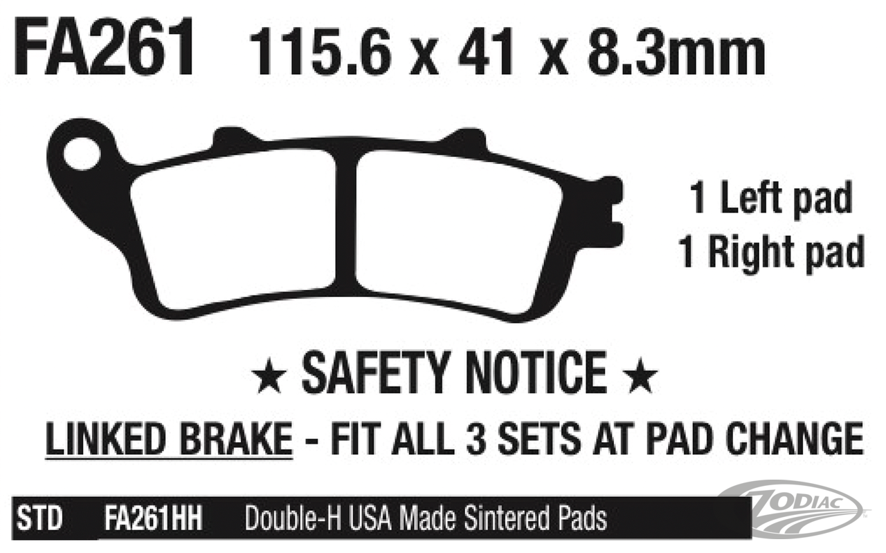 •EBC FA-Series provide fingertip stopping power, have low disc attack characteristics and medium lifetime. •EBC V-Series semi-sintered, are very gentle on the rotors and provide longer lifetime, zero brake noise and zero rotor galling. Easy to recognize because of their red backing plates. •EBC VLD-Series are the same material as V-Series but feature chrome backing plates •Galfer Standard: Semi-metallic G1054 material as found stock on most heavy weight motorcycles. Provides good braking performance and low wear •Galfer Sintered: Full sintered metal G1370/1371 material is similar as standard on the most recent high-performance motorcycles. Excellent braking performance and long lasting •SBS full sintered and EBC HH full sintered pads offer maximum stopping power and lifetime. Easy to recognize because of their copper colored backing plates.