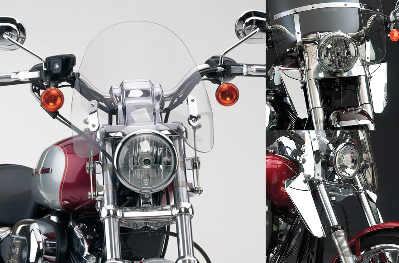 Fits 39mm front forks on 1988-1994 FXLR Low Rider Custom, 1993-2005 FXDL Low Rider, 1995-2005 FXD & FXDC Super Glide, 1994-2000 FXDS Super Glide Convertible, 1999-2005 FXDX Super Glide Sport, 1988-1994 FXR & FXRS Low Rider, 1988-2010 XL883 & 1200 Standard, 1996-2010 XL883C & XL1200C Custom, 2004-2013 XL883R Roadster, 2005-2010 XL883L Low, 2006-2011 XL1200L Low, 2009-2022 XL883N Iron, 2007-2012 XL1200N Nightster, 2018-2022 XL1200NS Iron and 2012-2016 XL1200V Seventy-Two, Clear Switchblade Deflector windshield only