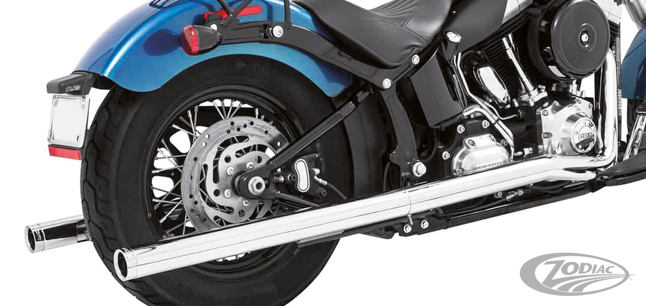 FEATURES & BENEFITS •The world's only complete 4.5" Muffler Softail performance system •Optimal horsepower & full range torque gains •2.5" O.D. full-length, 1-piece 220 degree heavy duty 16 gauge heat shields •Race version exhausts have 2-step baffle from 2.5" to 3" for optimum performance and Deep Throaty sound, with optional quiet baffles •O2 ports & plugs provided for early models •Complete with mounting hardware and brackets •All 2021 and later European models (Euro 5) require eliminators ZPN 744444 for the rear O2 sensor and digital tuning with Diag4Bike or similar to disable related CEL (Check Engine Light) and DTC's (Digital Trouble Code)