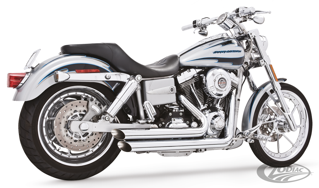 FEATURES & BENEFITS •2 step performance system for anti-reversion, full range torque and optimal horsepower •2 1/2" O.D. full 220º one-piece 16 gauge heavy duty heat shields •Race version exhausts have removable baffles with Hot Rod sound, optional quiet baffles available •O2 ports & plugs provided for early models •Offered in Chrome or Black hi-temp finish •Complete with mounting hardware and brackets •Fits Forward & Mid Controls •Does not fit FLD Switchback