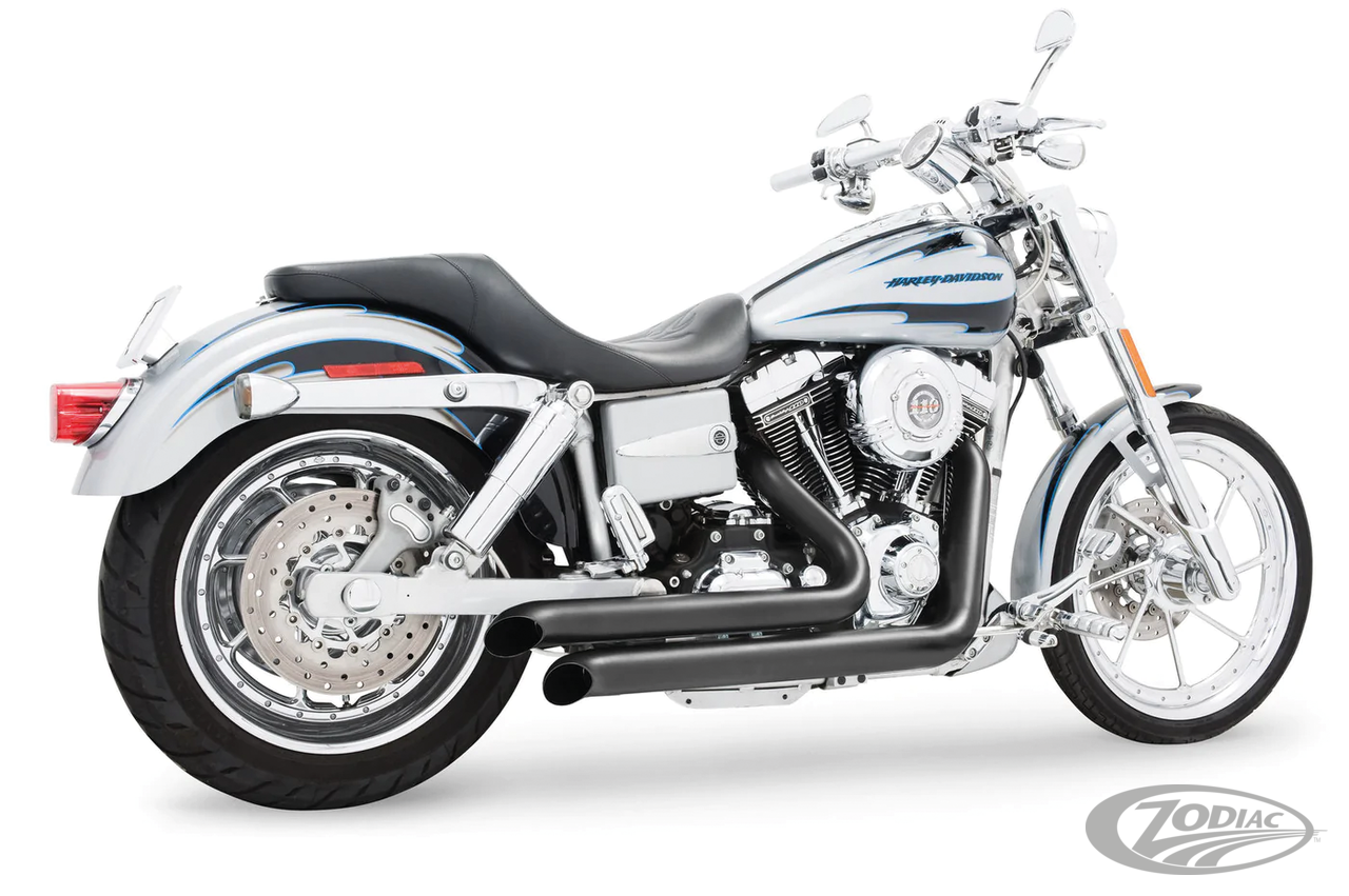 FEATURES & BENEFITS •2 step performance system for anti-reversion, full range torque and optimal horsepower •2 1/2" O.D. full 220º one-piece 16 gauge heavy duty heat shields •Race version exhausts have Hot Rod sound and removable baffles, optional quiet baffles available •O2 ports & plugs provided for early models •Offered in Chrome or Black hi-temp finish •Complete with mounting hardware and brackets •Fits Forward & Mid Controls •Does not fit FLD Switchback
