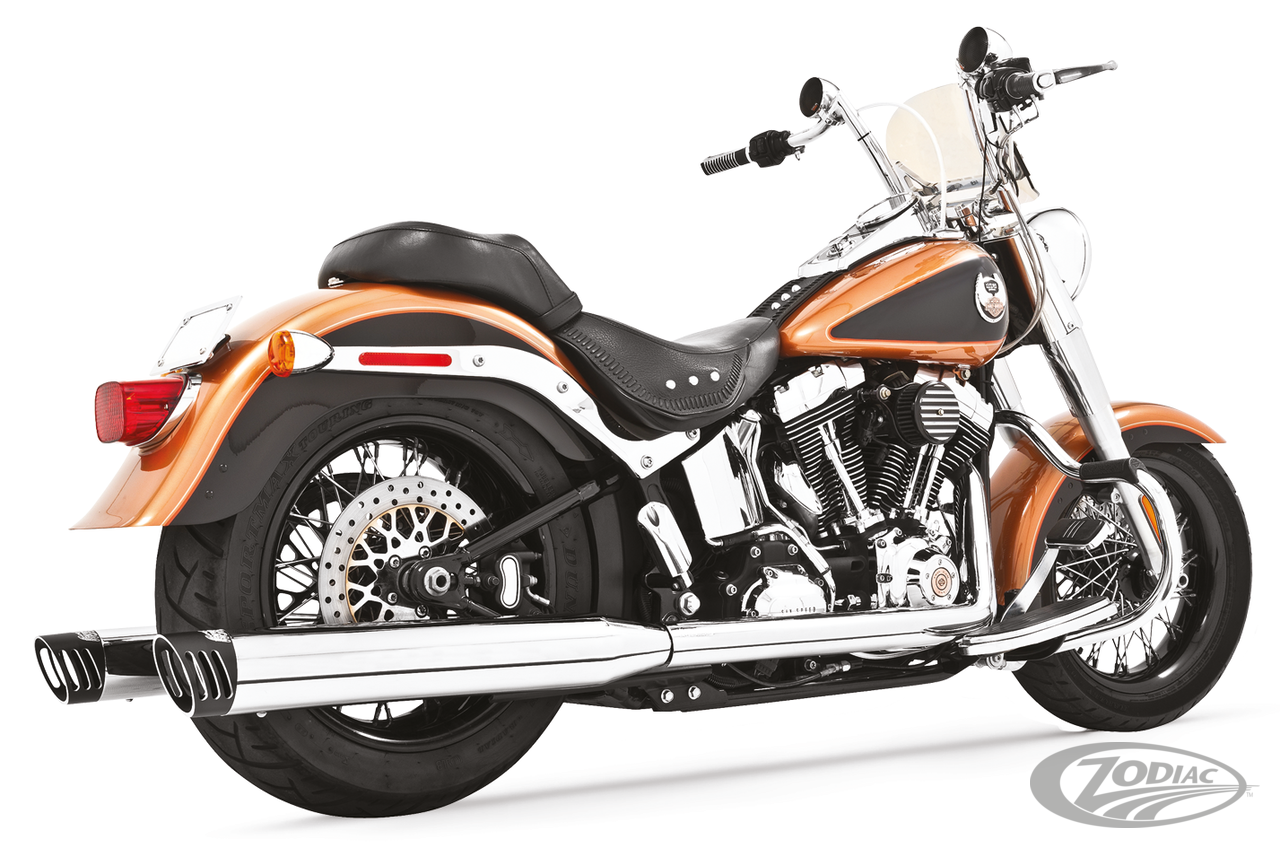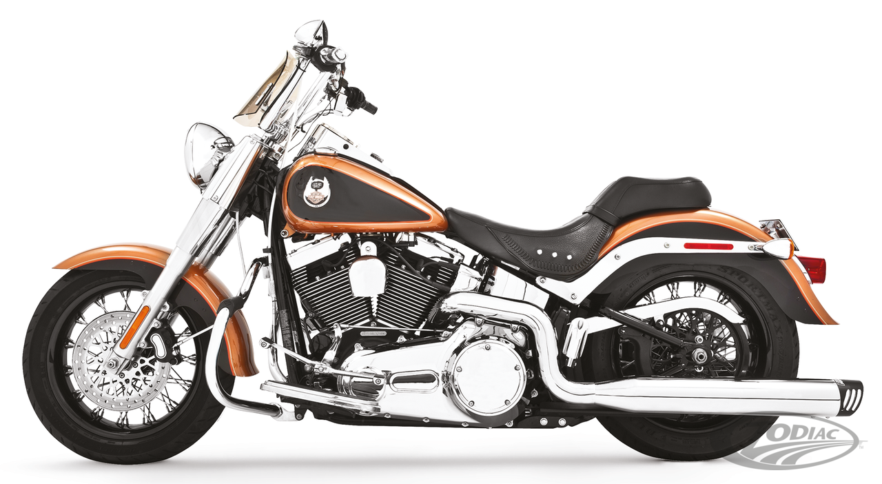 FEATURES & BENEFITS •The worlds only 5-step Softail performance exhaust system •Triple stepped headers for anti-reversion, full range torque and optimal horsepower •Race versions have 2 1/2" to 3" double stepped performance baffles with drag strip rumble or optional quiet baffles •4" muffler with 2 1/2" O.D. full-length, 1-piece 220º heavy duty, 16 gauge heat shields •O2 ports & plugs provided for early models •Complete with mounting hardware and brackets •All 2021 and later European models (Euro 5) require eliminators ZPN 744444 for the rear O2 sensor and digital tuning with Diag4Bike or similar to disable related CEL (Check Engine Light) and DTC's (Digital Trouble Code)