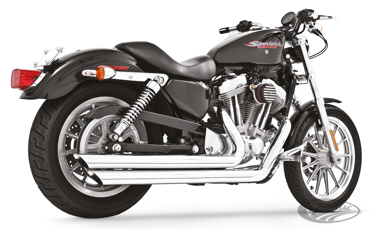 FEATURES & BENEFITS •2 step performance system for anti-reversion, full range torque and optimal horsepower •2 1/2" O.D. full 220º one-piece 16 gauge heavy duty heat shields •Racing exhausts have Hot Rod sound and removable baffles, optional quiet baffles available •O2 ports & plugs provided for early models •Offered in Chrome or Black hi-temp finish •Complete with mounting hardware and brackets •Fits Forward & Mid Controls