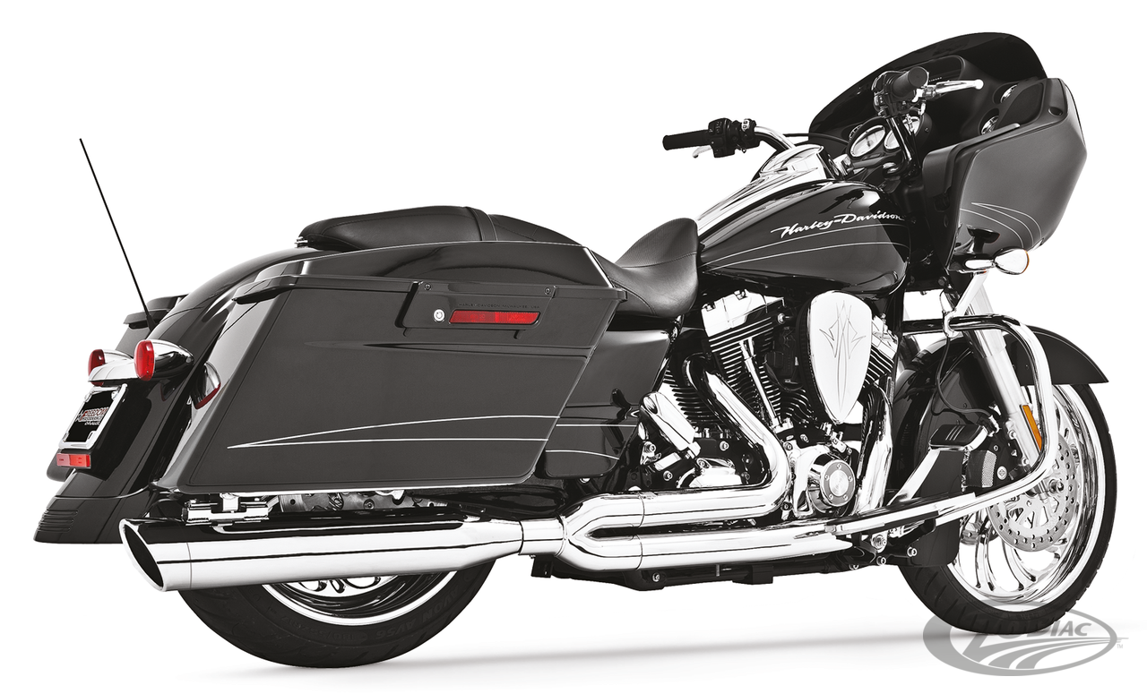 FEATURES & BENEFITS •The worlds only 5-step 2-into-1 performance exhaust system for Touring •3-step header pipes 1 3/4" to 1 7/8" to 2" for anti-reversion, full range torque and horsepower •Race versions have 2-step removable baffle 2 1/2" to 3" with quiet baffle available •2 1/2" 220º one piece heavy duty 16 gauge heat shields •4" Diameter slash-cut end cap with rolled edge that mounts slash up or slash down •O2 ports & plugs provided for early models •All 2021 and later European models (Euro 5) require eliminators ZPN 744444 for the rear O2 sensor and digital tuning with Diag4Bike or similar to disable related CEL (Check Engine Light) and DTC's (Digital Trouble Code) •Complete with mounting hardware and brackets