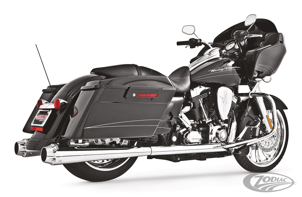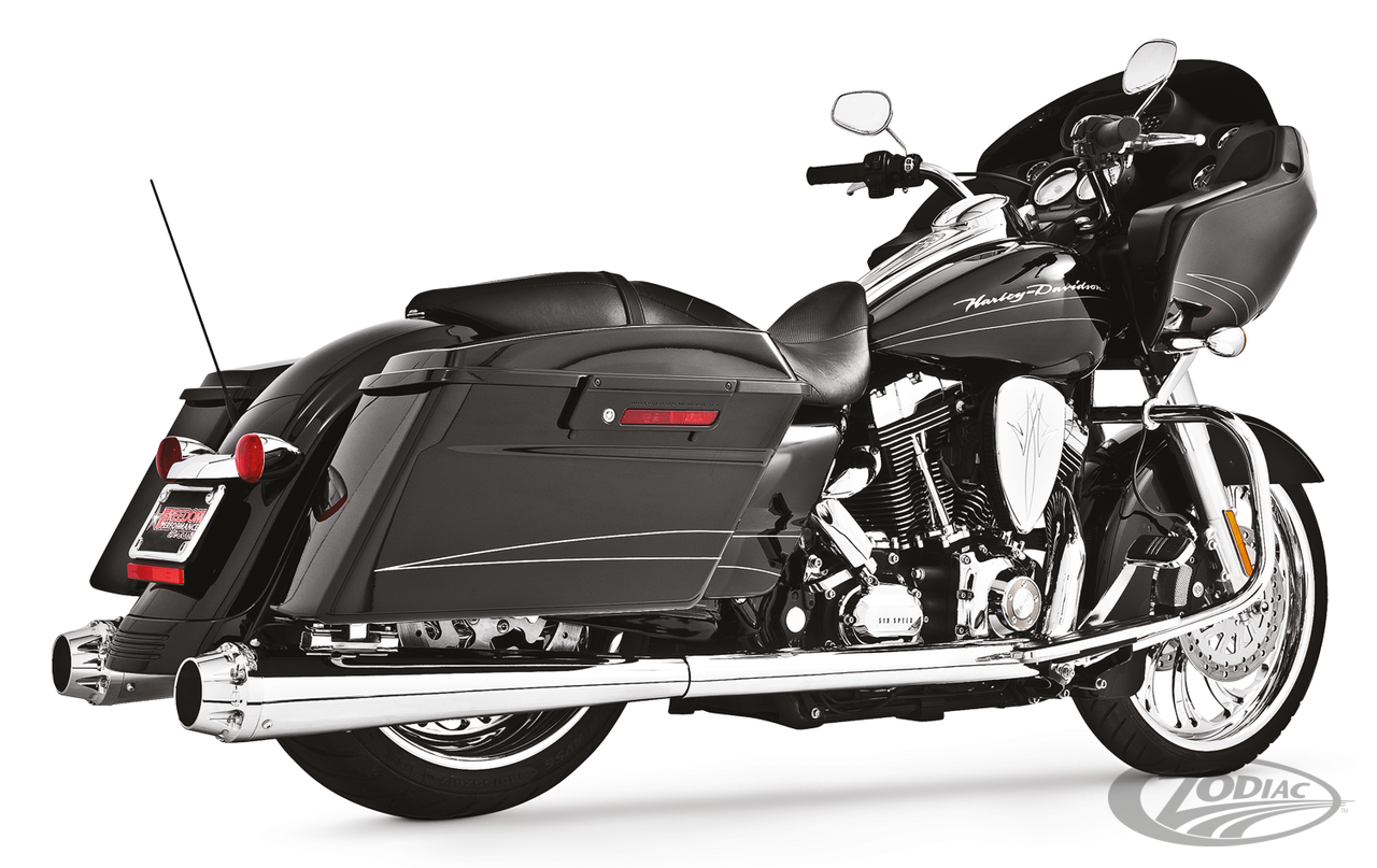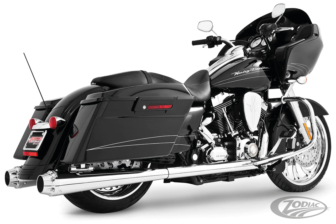 FEATURES & BENEFITS •The world's only 5-step 4 1/2" Megaphone Touring exhaust system •Triple stepped headers for anti-reversion, full range torque and optimal horsepower •4 1/2" megaphone with 2 1/2" O.D. full-length, 1-piece 220º heavy duty 16 gauge heat shields •Race versions have 2 1/2" louvered to 3" stepped "Bandit" performance baffles with a deep throaty sound. Optional quiet baffles available •O2 ports & plugs provided for early models •Complete with mounting hardware and brackets