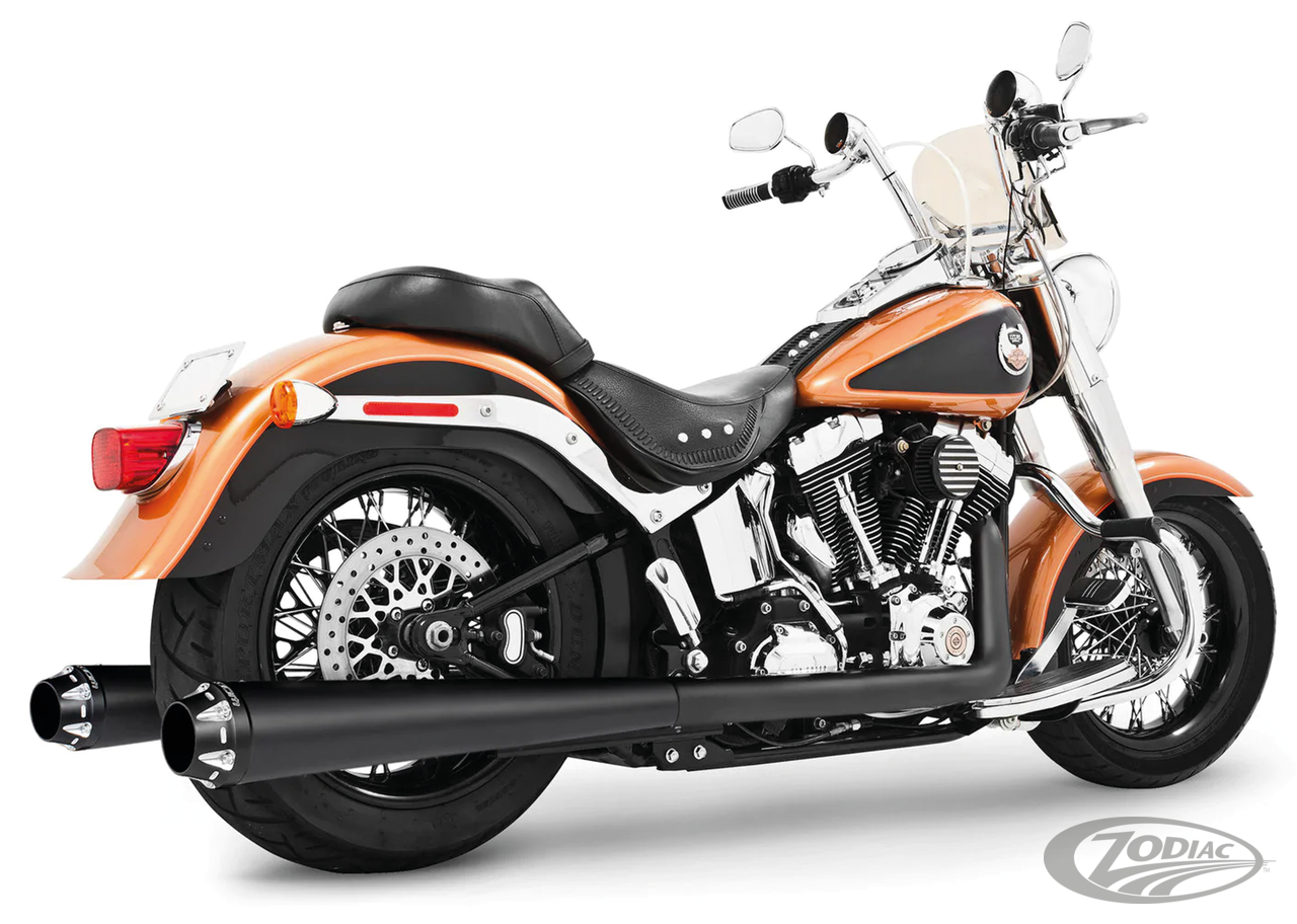 FEATURES & BENEFITS •The world's only 5-step Softail 4 1/2" Megaphone exhaust system •Race versions have 2 1/2" louvered to 3" stepped "Bandit" performance baffles with deep throaty sound or optional quiet baffles •Triple stepped headers for anti-reversion, full range torque and optimal horsepower •4 1/2" megaphone with 2 1/2" O.D. full-length, 1-piece 220º heavy duty 16 gauge heat shields •O2 ports & plugs provided for early models •Complete with mounting hardware and brackets •All 2021 and later European models (Euro 5) require eliminators ZPN 744444 for the rear O2 sensor and digital tuning with Diag4Bike or similar to disable related CEL (Check Engine Light) and DTC's (Digital Trouble Code)