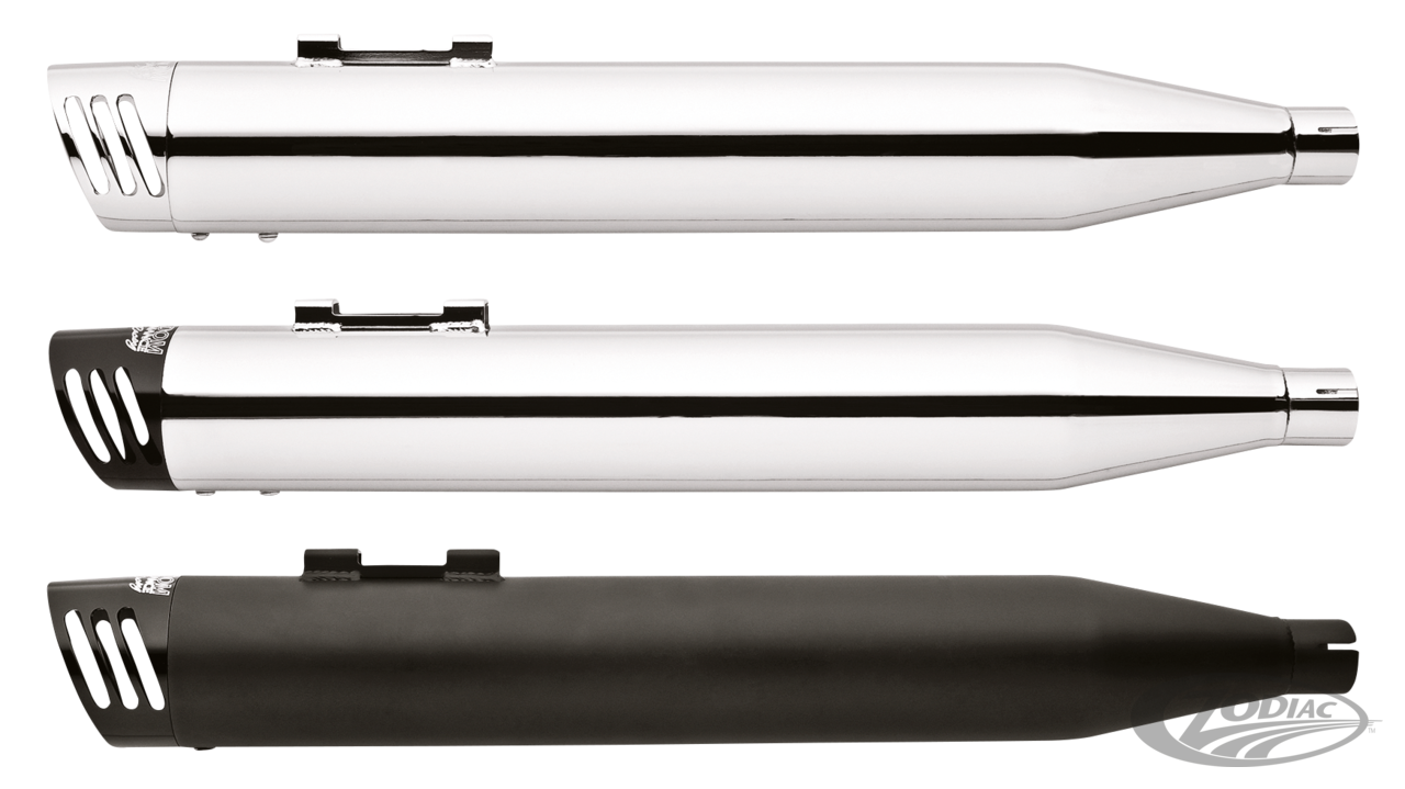FEATURES & BENEFITS •Mufflers that fit stock headers •Choice of distinctive styling billet end tips in either Chrome or Black finish •Race version exhausts have removable baffles with acoustic packing for deep rich tone, optional quiet baffles available •Complete with mounting hardware and brackets •Easy installation using stock mounting brackets