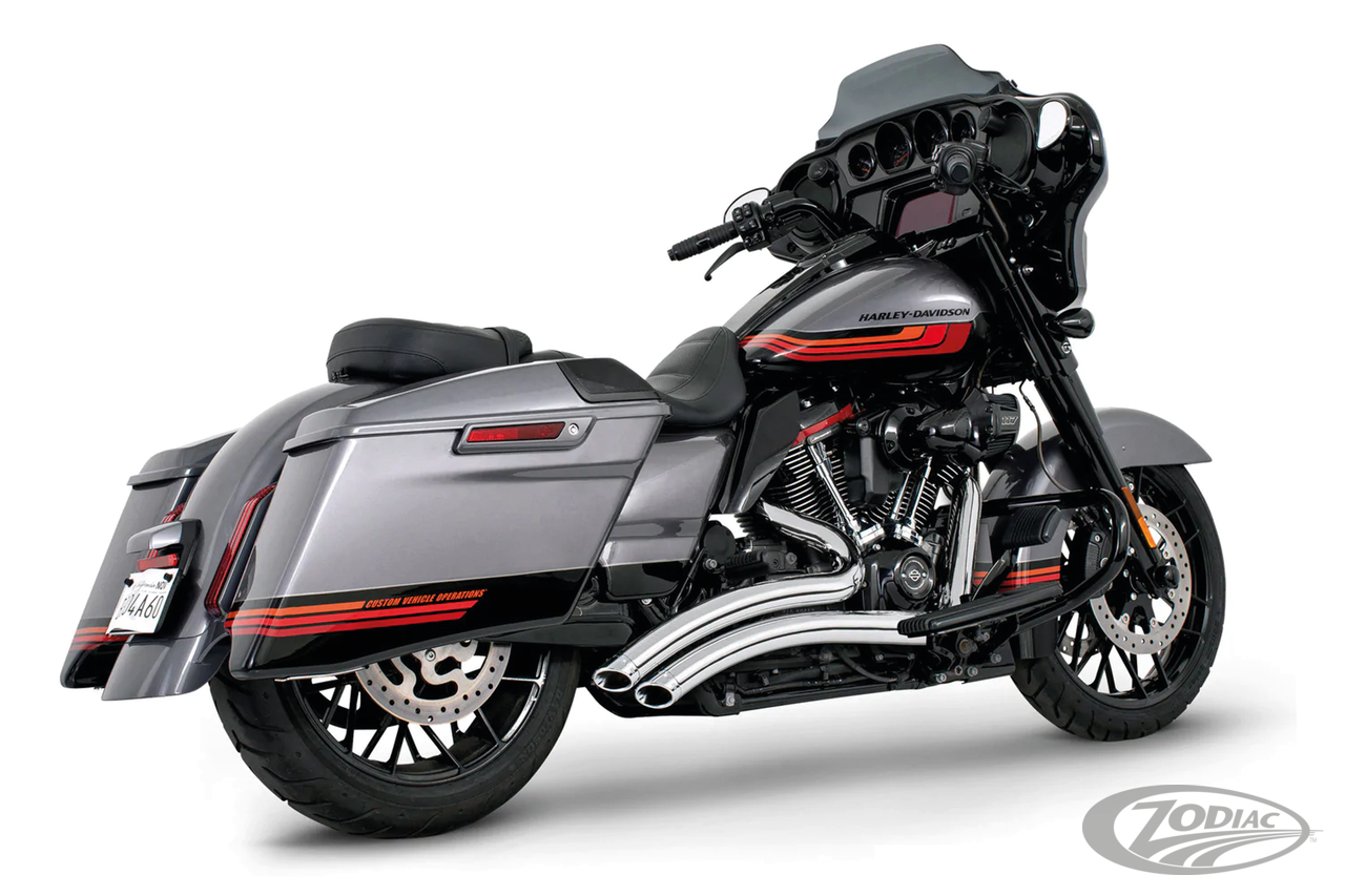 FEATURES & BENEFITS •Performance collector for maximum power and torque •1-piece full length heat shields prevent chipping, rust and peeling between sections •Large 2 1/2" 16 gauge heavy duty 220º blue proof shields available in chrome or black hi-temp finish •Exhausts have scoop tips or billet endcaps •Baffles are removable and optional Quiet Baffles are available •O2 ports & plugs provided for early models •Complete with mounting hardware and brackets •All 2021 and later European models (Euro 5) require eliminators ZPN 744444 for the rear O2 sensor and digital tuning with Diag4Bike or similar to disable related CEL (Check Engine Light) and DTC's (Digital Trouble Code) •Unmatched sound & performance