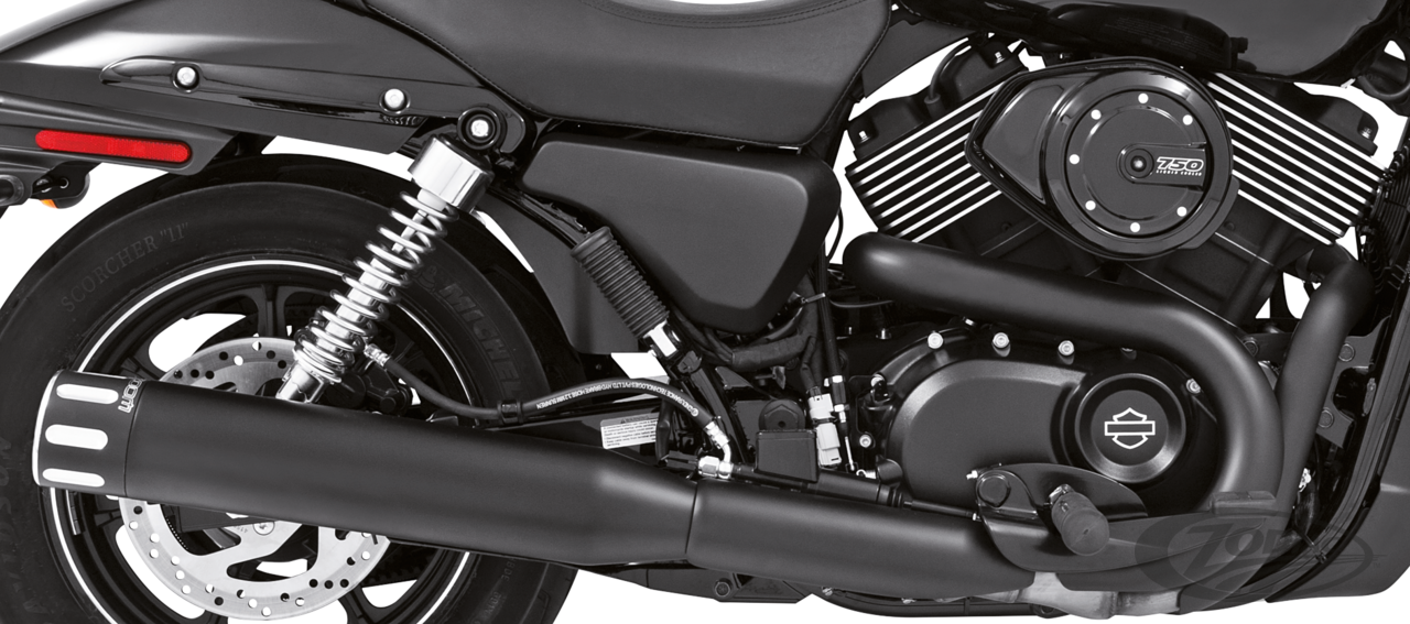 FEATURES & BENEFITS •4" Mufflers that fit stock head pipes •Chrome or black end caps available •Interchangeable baffles •Acoustic packing for deep throaty sound •Bolt on performance and low end torque •Complete with mounting hardware and brackets •Fits Street 500 & Street 750 2015 to present