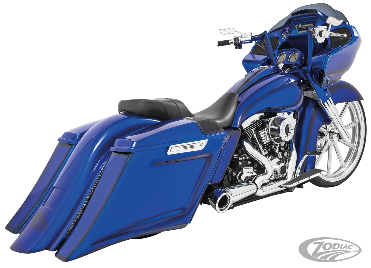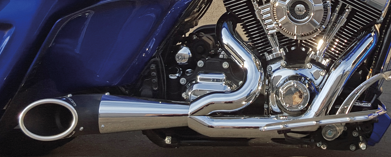 FEATURES & BENEFITS •Triple stepped headers 1 3/4" to 1 7/8" to 2" for increases of 15-18 HP and 13-15 foot lbs. of torque •Mufflers have removable baffles with a deep, rich and throaty sound, optional quiet baffles available •System equals 5 steps throughout for extreme power gains •System reduces heat concentration by 30% •Boasting full-coverage one-piece (220°) blue-proof heatshields (available in chrome or ceramic black) •Customizable with a show chrome, sculpted black or pitch black tip •Includes O2 sensor ports, plugs and all mounting hardware •Engineered for maximum power! •All 2021 and later European models (Euro 5) require eliminators ZPN 744444 for the rear O2 sensor and digital tuning with Diag4Bike or similar to disable related CEL (Check Engine Light) and DTC's (Digital Trouble Code) •Made in USA