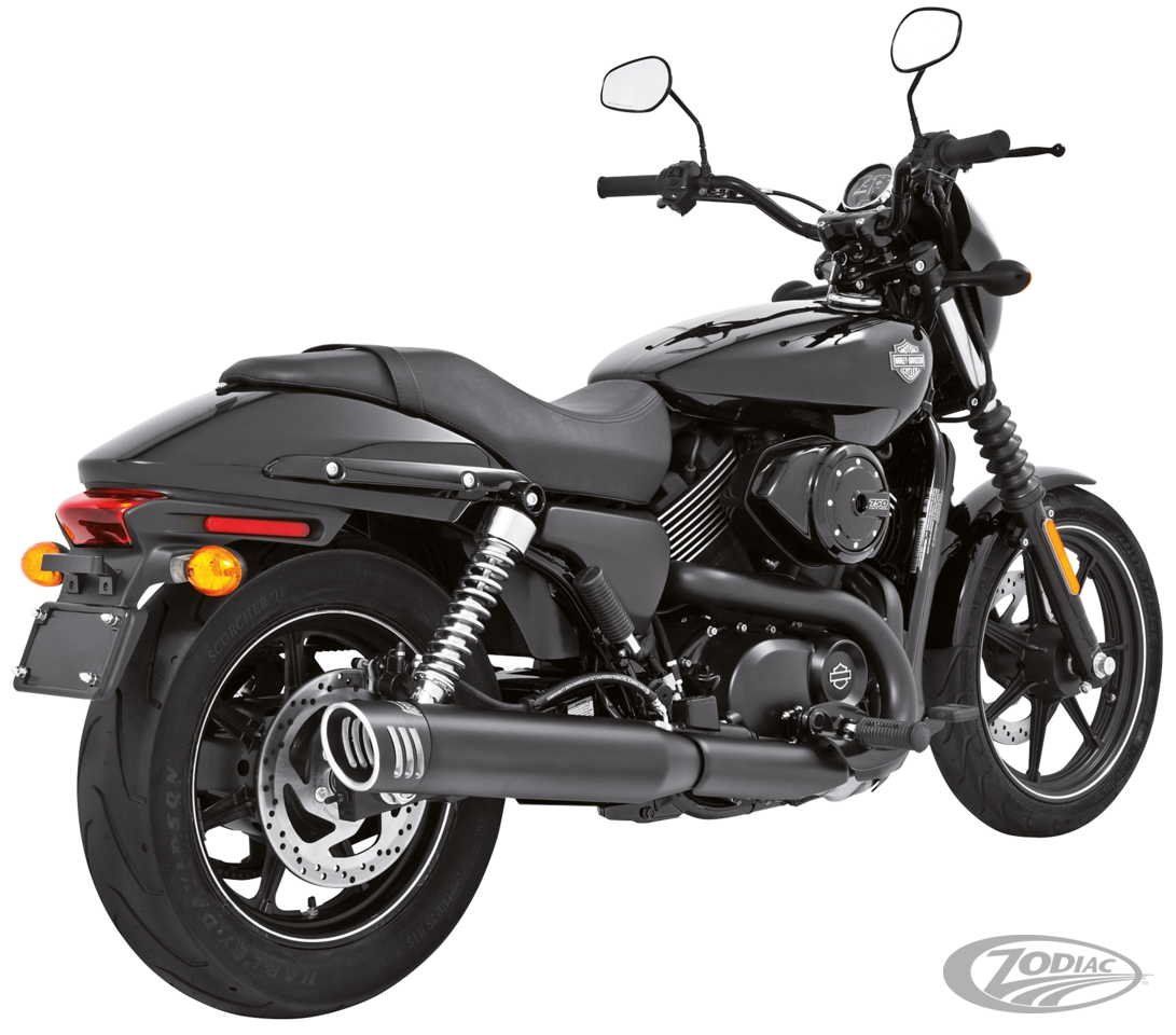 FEATURES & BENEFITS • 4" Mufflers that fit stock head pipes • Chrome or black end caps available • Interchangeable baffles • Acoustic packing for deep throaty sound • Bolt on performance and low end torque • Complete with mounting hardware and brackets • Fits Street 500 and Street 750 2015 to present