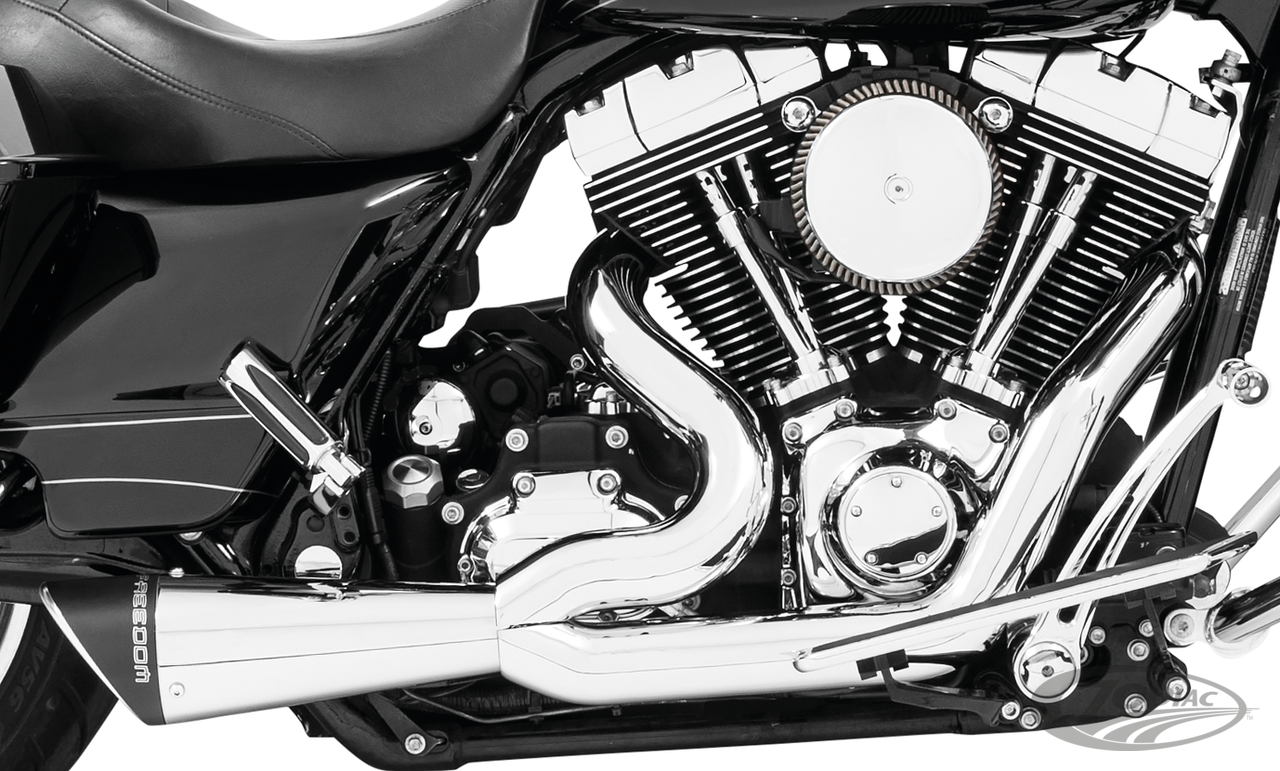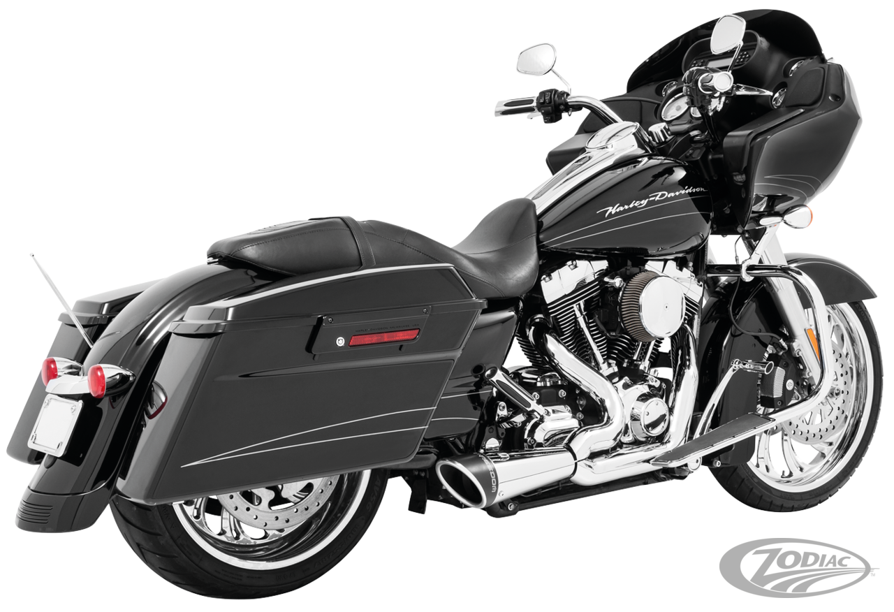 FEATURES & BENEFITS •Triple stepped headers 1 3/4" to 1 7/8" to 2" for increases of 15-18 HP and 13-15 foot lbs. of torque •Mufflers have removable baffles with a deep, rich and throaty sound, optional quiet baffles available •System equals 5 steps throughout for extreme power gains •System reduces heat concentration by 30% •Boasting full-coverage one-piece (220°) blue-proof heatshields (available in chrome or ceramic black) •Customizable with a show chrome, sculpted black or pitch black tip •Includes O2 sensor ports, plugs and all mounting hardware •Engineered for maximum power! •All 2021 and later European models (Euro 5) require eliminators ZPN 744444 for the rear O2 sensor and digital tuning with Diag4Bike or similar to disable related CEL (Check Engine Light) and DTC's (Digital Trouble Code) •Made in USA