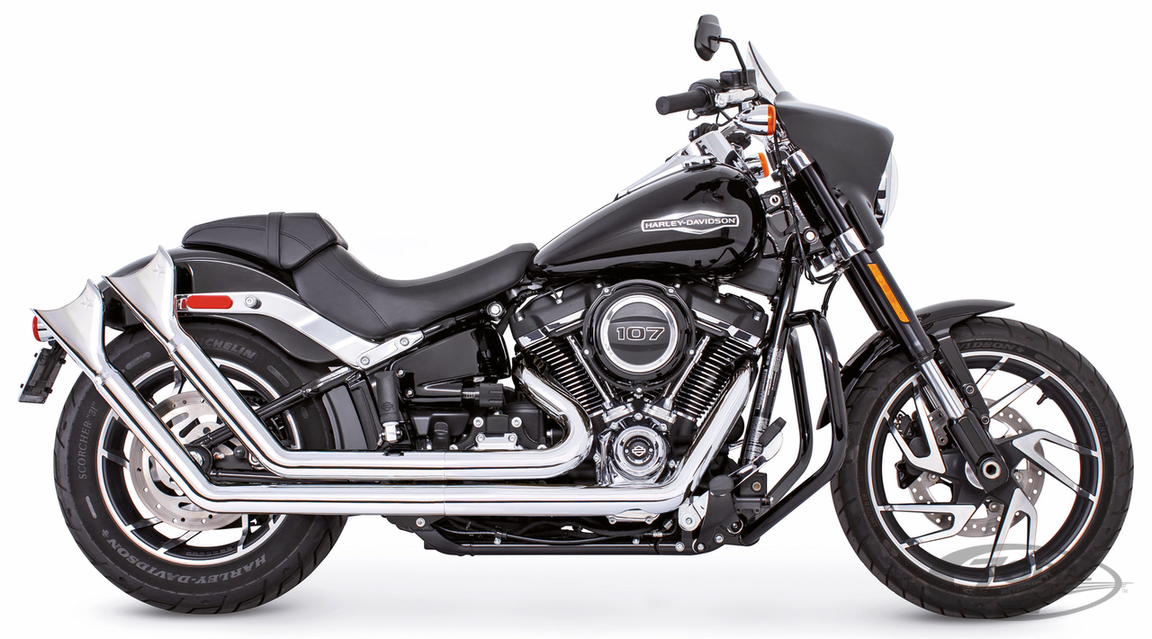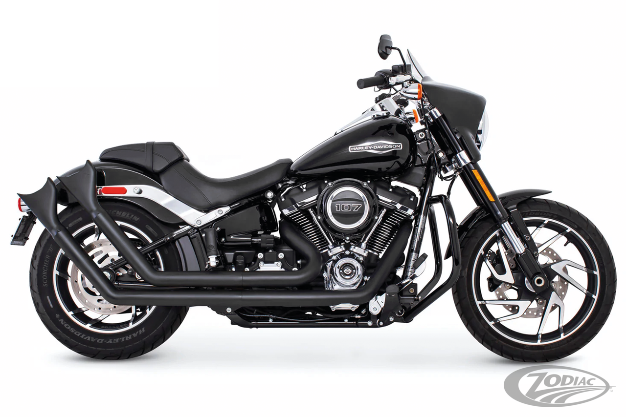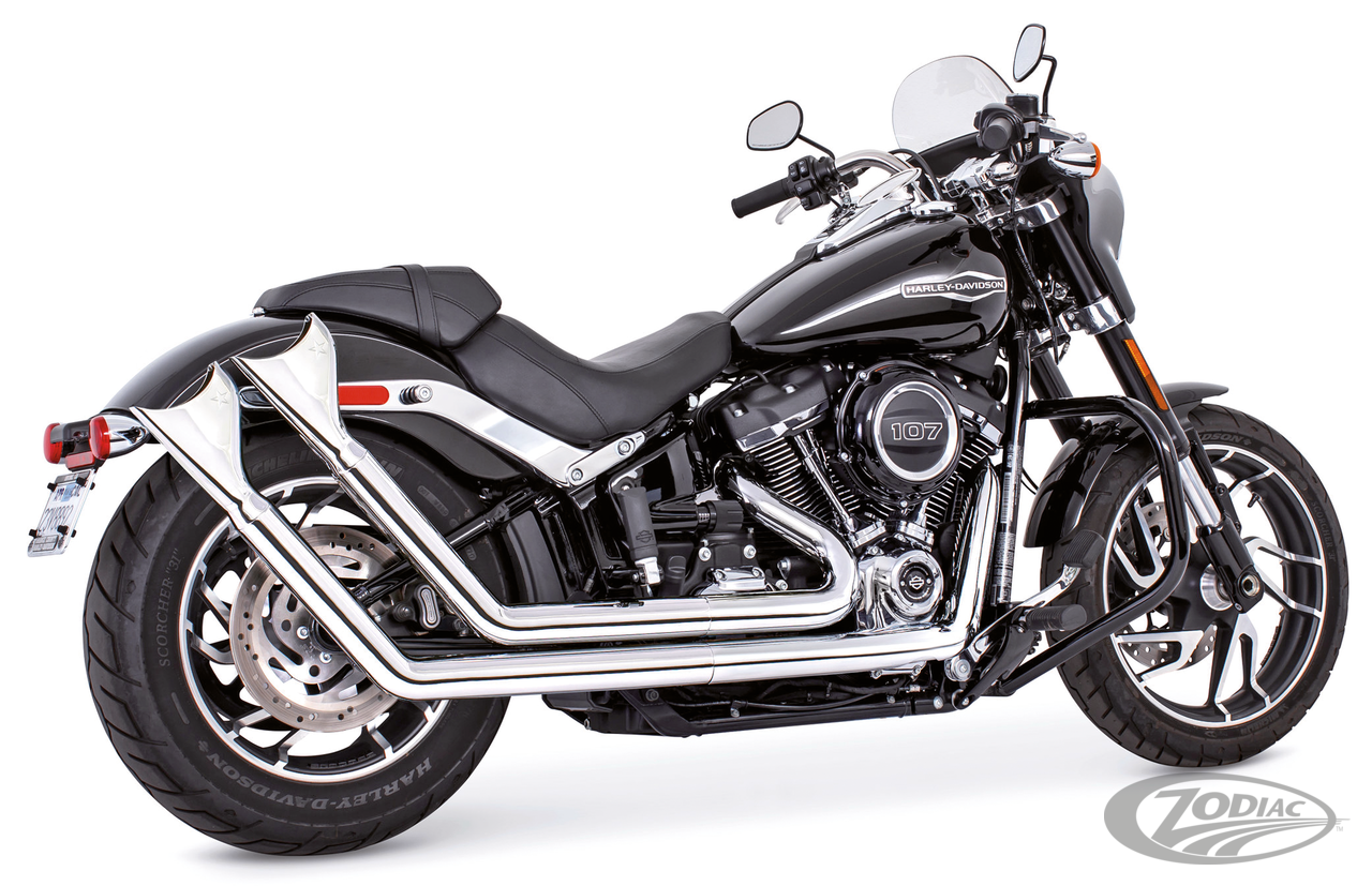 FEATURES & BENEFITS •2 step performance system for anti-reversion, full range torque and optimal horsepower •2 1/2" O.D. full 220º one-piece 16 gauge heavy duty heat shields •Giving you a chopper/bobber vintage look •Racing exhausts have removable baffles and Hot Rod sound, optional quiet baffles available •O2 ports & plugs provided for early models •Offered in Chrome or Black hi-temp finish •Complete with mounting hardware and brackets •All 2021 and later European models (Euro 5) require eliminators ZPN 744444 for the rear O2 sensor and digital tuning with Diag4Bike or similar to disable related CEL (Check Engine Light) and DTC's (Digital Trouble Code)