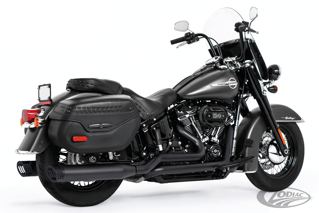 FEATURES & BENEFITS •The worlds only 5-step Softail performance exhaust system •Triple stepped headers for anti-reversion, full range torque and optimal horsepower •Race versions have 2 1/2" to 3" double stepped performance baffles with drag strip rumble or optional quiet baffles •4" muffler with 2 1/2" O.D. full-length, 1-piece 220º heavy duty, 16 gauge heat shields •O2 ports & plugs provided for early models •Complete with mounting hardware and brackets •All 2021 and later European models (Euro 5) require eliminators ZPN 744444 for the rear O2 sensor and digital tuning with Diag4Bike or similar to disable related CEL (Check Engine Light) and DTC's (Digital Trouble Code)