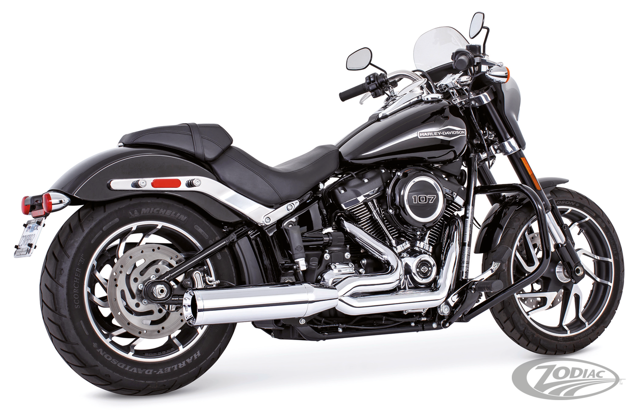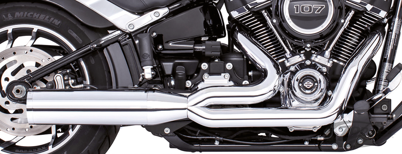 FEATURES & BENEFITS •The worlds only 5-step Softail 2-into-1 performance exhaust system •3-step header pipes 1 3/4" to 1 7/8" to 2" for anti-reversion, full range torque and horsepower •Race versions have 2-step removable baffle 2 1/2" to 3" with quiet baffle available •2 1/2" 220º one piece heavy duty 16 gauge heat shields •4" Diameter slash-cut end cap with rolled edge that mounts slash up or slash down •O2 ports & plugs provided for early models provided •Complete with mounting hardware and brackets