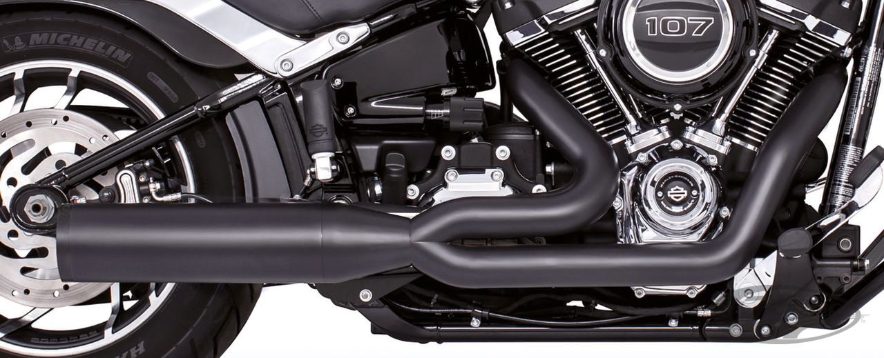 FEATURES & BENEFITS •The worlds only 5-step Softail 2-into-1 performance exhaust system •3-step header pipes 1 3/4" to 1 7/8" to 2" for anti-reversion, full range torque and horsepower •Race versions have 2-step removable baffle 2 1/2" to 3" with quiet baffle available •2 1/2" 220º one piece heavy duty 16 gauge heat shields •4" Diameter slash-cut end cap with rolled edge that mounts slash up or slash down •O2 ports & plugs provided for early models provided •Complete with mounting hardware and brackets