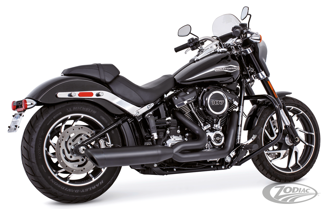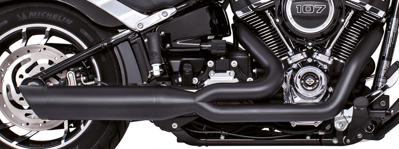 FEATURES & BENEFITS •The worlds only 5-step Softail 2-into-1 performance exhaust system •3-step header pipes 1 3/4" to 1 7/8" to 2" for anti-reversion, full range torque and horsepower •Race versions have 2-step removable baffle 2 1/2" to 3" with quiet baffle available •2 1/2" 220º one piece heavy duty 16 gauge heat shields •4" Diameter slash-cut end cap with rolled edge that mounts slash up or slash down •O2 ports & plugs provided for early models provided •Complete with mounting hardware and brackets