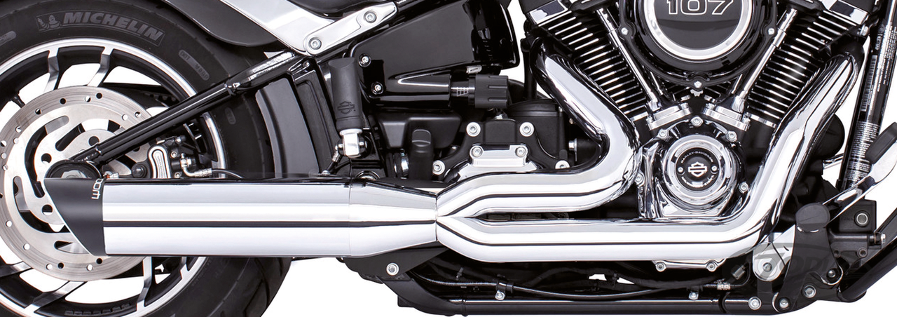 FEATURES & BENEFITS •The worlds only 5-step Softail 2-into-1 performance exhaust system •3-step header pipes 1 3/4" to 1 7/8" to 2" for anti-reversion, full range torque and horsepower •Race versions have 2-step removable baffle 2 1/2" to 3" with quiet baffle available •2 1/2" 220º one piece heavy duty 16 gauge heat shields •4" Diameter slash-cut end cap with rolled edge that mounts slash up or slash down •O2 ports & plugs provided for early models provided •Complete with mounting hardware and brackets