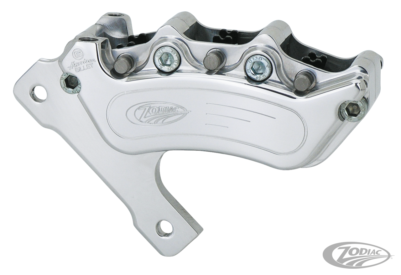Harrison Engineering was, back in 1986, one of the first companies to design and develop a multi-piston aftermarket caliper for Harley-Davidson motorcycles. Each fully progressive 4 or 6 Piston caliper is precisely CNC machined from lightweight blocks of aircraft quality aluminum alloy. To keep the internal tolerances to a minimum, the caliper pistons are machined from special low expansion aluminum alloy and have a hard anodized finish that has the same anti-wear properties as hardened steel. For maximum performance the calipers have one pad for each piston. Harrison claims this gives a more ‘leading edge bite' on the disc than any two pad, or differential bore calipers. It is also especially beneficial in wet conditions, because the first set of pads sweep water off the disc, while the following 2 or 4 pads are still ‘biting' on the disc. That removes the effect of the calipers ‘skating' on the disc, and then braking sharply and suddenly when the disc becomes dry. They are truly progressive calipers, with a direct and sensitive relation between the amount of lever pressure, and the amount of braking power. These show polished or black anodized calipers not only have ultimate stopping power, they also have the ultimate looks, and are available for almost all models. The front calipers bolt straight to the front fork bottom leg, and the rear sets include the mounting bracket. Stainless steel shims, to space the caliper to the disc, and mounting bolts are included with each kit. The front as well as the rear sets are available in both 4 or 6 piston versions, as well as polished or black anodized. Matching design brake rotors can be found elsewhere in this catalogue. All Harrison Billet calipers are approved, and come with a limited lifetime warranty on piston wear.