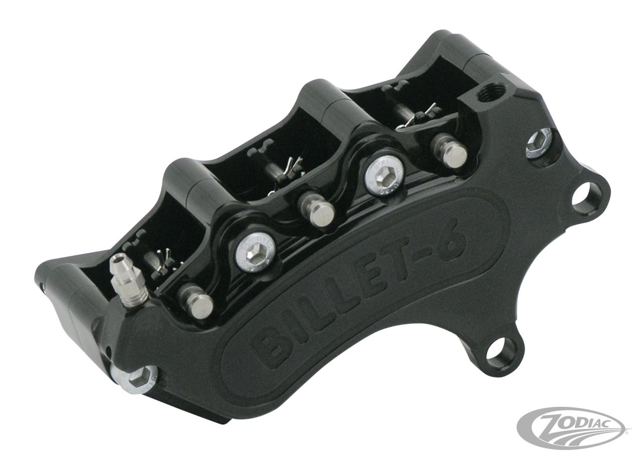 Harrison Engineering was, back in 1986, one of the first companies to design and develop a multi-piston aftermarket caliper for Harley-Davidson motorcycles. Each fully progressive 4 or 6 Piston caliper is precisely CNC machined from lightweight blocks of aircraft quality aluminum alloy. To keep the internal tolerances to a minimum, the caliper pistons are machined from special low expansion aluminum alloy and have a hard anodized finish that has the same anti-wear properties as hardened steel. For maximum performance the calipers have one pad for each piston. Harrison claims this gives a more ‘leading edge bite' on the disc than any two pad, or differential bore calipers. It is also especially beneficial in wet conditions, because the first set of pads sweep water off the disc, while the following 2 or 4 pads are still ‘biting' on the disc. That removes the effect of the calipers ‘skating' on the disc, and then braking sharply and suddenly when the disc becomes dry. They are truly progressive calipers, with a direct and sensitive relation between the amount of lever pressure, and the amount of braking power. These show polished or black anodized calipers not only have ultimate stopping power, they also have the ultimate looks, and are available for almost all models. The front calipers bolt straight to the front fork bottom leg, and the rear sets include the mounting bracket. Stainless steel shims, to space the caliper to the disc, and mounting bolts are included with each kit. The front as well as the rear sets are available in both 4 or 6 piston versions, as well as polished or black anodized. Matching design brake rotors can be found elsewhere in this catalogue. All Harrison Billet calipers are approved, and come with a limited lifetime warranty on piston wear.