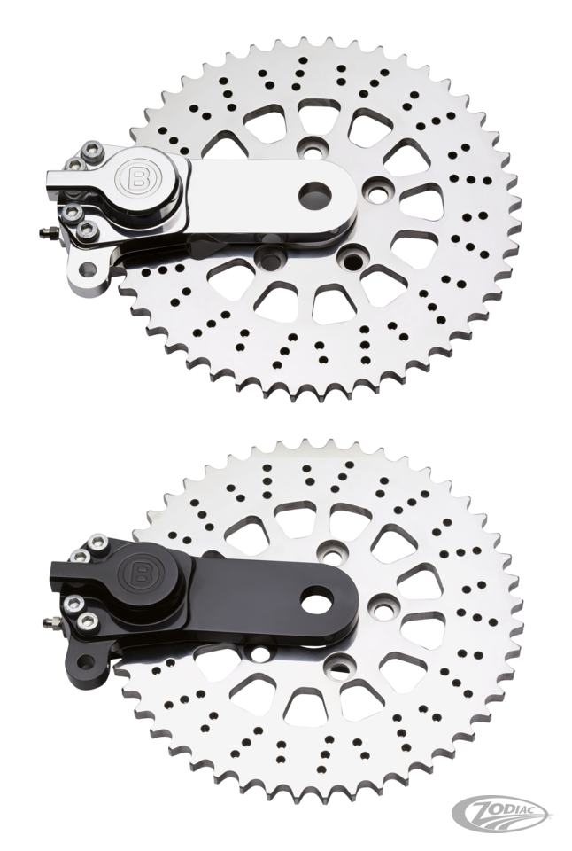 A small but powerful billet aluminum 2-piston caliper on a billet aluminum bracket. Comes complete with a 48 tooth sprocket for use with 530 series chain. The polished stainless steel chain sprocket is available with 2" (50.8mm) inner diameter for use with wheel hubs styles up to 1999, or a 2.22" (56.4mm) inner diameter for use with 2000 to present style wheel hubs. Caliper bracket has a 1" diameter axle hole which can also be used for 25mm wheel axles. Must be spaced out for use with 3/4" (19.05mm) wheel axles. Available for both left and right side use with the caliper and bracket in polished or black anodized.