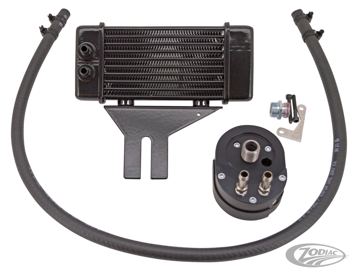 The Jagg 10-row Low Mount oil cooler system is designed to deliver and keep a low-profile. The single-pass HyperFlow oil cooler is optimized for the Twin Cam engine and consequently works great on Evolution too. This cooler offers significantly more cooling surface-area than its closest competitor and ensures unsurpassed flow, heat rejection and the best heat-exchange, all while hiding neatly behind the fender and beneath the voltage regulator. All cooler kits come with Jagg's unique sandwich style satin black anodized thermostatically controlled offset oil filter adapter that installs between the stock oil filter mount and the filter. This provides an easy access point to the bike's oil supply for the installation of the oil cooler. All Jagg 10-row Oil Cooler Systems are supplied complete with the oil cooler, offset oil filter adapter, all necessary hardware and detailed, easy-to-follow installation instructions.