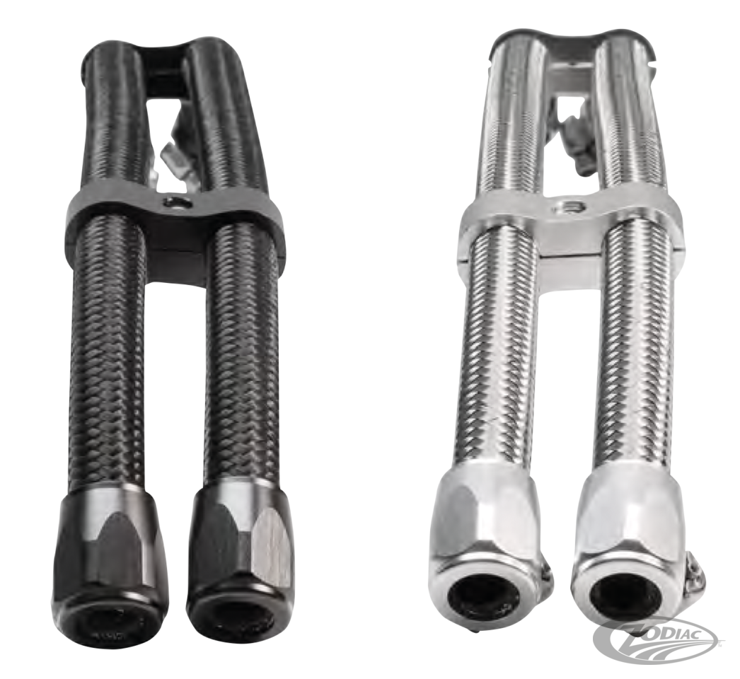 Set your bike apart and give your Jagg oil cooler installation a racy look with a set of performance braided oil hoses. The length of the hoses is 12" (30.5cm) and they are available in bright stainless-steel or Black lightweight fiber. The hose kits are equipped with one pair aluminum hose separators and two pair of aluminum hose finishers in matching color. Simply trim hose to required length, slip hose finishers over ends of hose, press hose onto nipple, and tighten hose clamp, to achieve an easy and beautiful upgrade. Hose features internal steel wire reinforcement and braided outer jacket for structure, toughness and racy look. Hose finishers with integrated worm-drive hose clamps dress up hose ends and make for solid connections. Hose separators manage hose lengths, keeping hose tight and tidy.