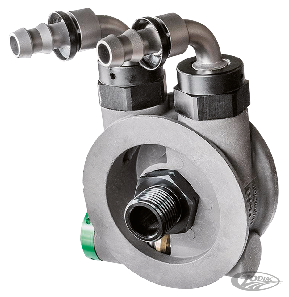 The #4550 is an updated version of the #4400 oil filter adaptor. It is designed to work with front-mounted spin on oil filters. Provides easy access to the oil supply for fitment of an oil cooler on all Evolution Sportster, air cooled Buell and carburated Evolution Big Twin. The built-in thermostatic oil valve allows oil to by-pass the oil cooler until reaching operating temperature for faster vehicle warmup times.