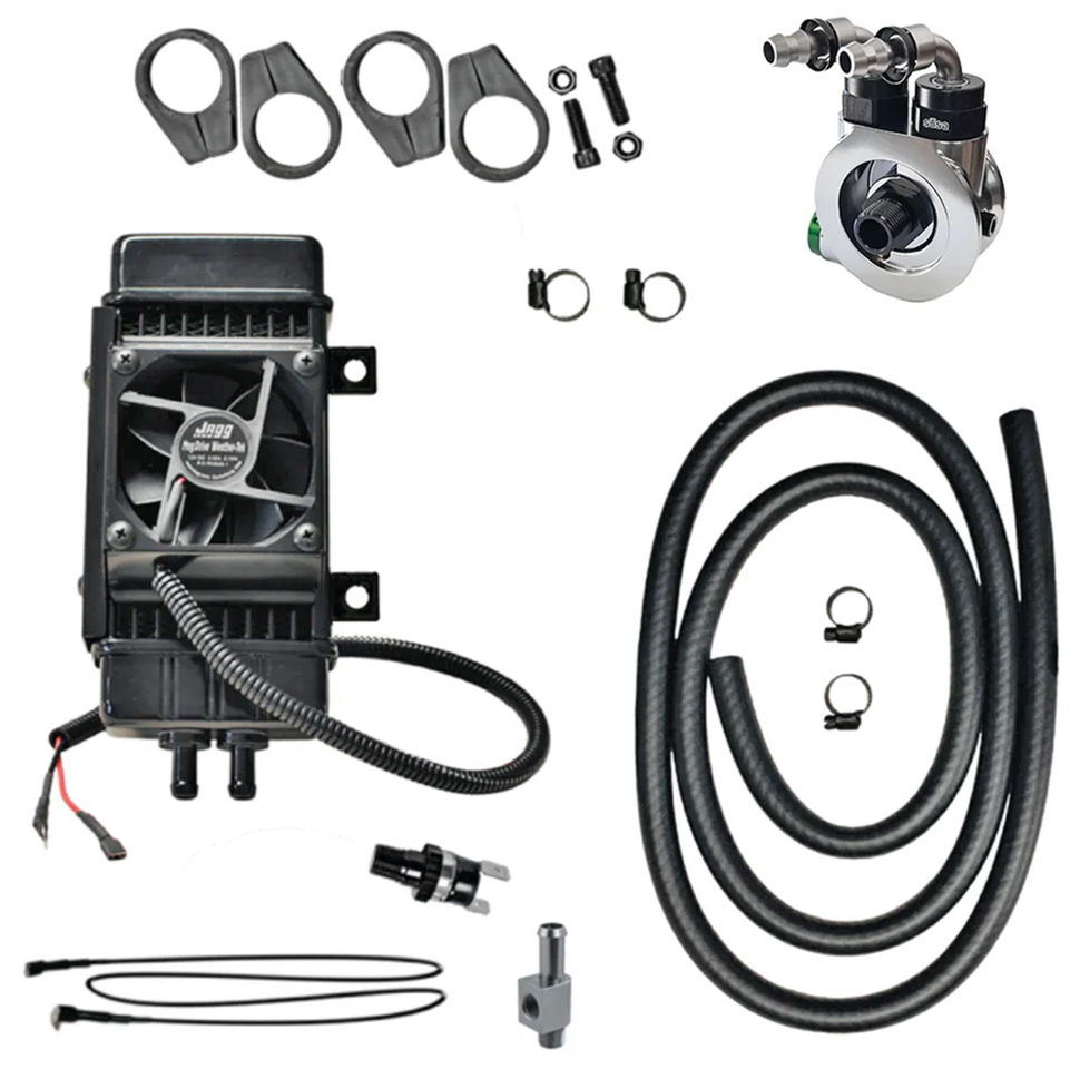 Extreme performance in a compact package, the Jagg Fan-assisted Vertical Oil Cooler system is designed to perform as well at low vehicle speeds and in stop-and-go traffic as on the open highway. The 10-row high-performing two-pass Jagg oil cooler is engineered to fit all bikes with vertical frame tubes. Specifically designed to exceed the cooling demands of the modern V-Twin motorcycle. Smooth end caps and a gloss-black finish help this cooler blend in with the frame and hardware for a clean, streamlined look. The cooler mounts to the left frame down-tube, spaced away from the frame to allow airflow to both the oil cooler and the engine's cylinders. The cooler is mounted to the frame using unique, highly-durable, Uralite mounts, which have a shock absorbing effect and clean styling. The 10-tube, two-pass design offers significantly more cooling surface than its closest competitor. Special in-line turbulators add to the cooler's efficiency with minimal oil pressure loss or restriction. Aluminum construction with durable powder coated finish. The Jagg WeatherTek, a worldwide exclusive dust-tight and waterproof fan, turns on automatically at circa 100°C (210°F) and pulls a full 75cfm across the cooler. The included Jagg's unique thermostatically-controlled offset oil filter adapter provides an easy access point to the bike's oil supply for the installation of the oil cooler. The sandwich-style adapter is machined from two pieces of billet aluminum and then hard-anodized to a satin black finish. The adapter installs between the bike's stock oil filter mount and the oil filter, and is designed with the same Hyper Flow Technology as all Jagg components to ensure great performance as well as great flow characteristics. The Fan-assisted Vertical Oil Cooler System is supplied complete with all necessary hardware and detailed, easy-to-follow installation instructions. Note: These coolers do not fit Twin Cooled engines (also known as Mount Rushmore or Water Heads) as used in some Touring and Trike. They also do not fit models equipped with fairing lowers.