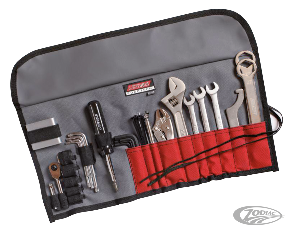The perfect travel tool kit for road-side repairs and adjustments for a wide range of Indian motorcycles. Kit is developed to suit 21st Century Indian Chief, Chieftain, Roadmaster and Scout models but will of course also work with other motorcycles. Kit includes a pair of 27mm axle wrenches, a 14x16mm hex axle adapter, 13mm, 12mm and 10mm combination wrenches, 8" adjustable wrench, mini ratchet with 13mm, 12mm, 10mm and 8mm sockets, 5 torx keys, 5 hex keys, 6-in-1 screwdriver, locking pliers, shock adjusting tool, tire pressure gauge and hardware like cable ties, duct tape and mechanics wire. Tools are organised in a handy roll-up pouch and can be stored in a variety of places.