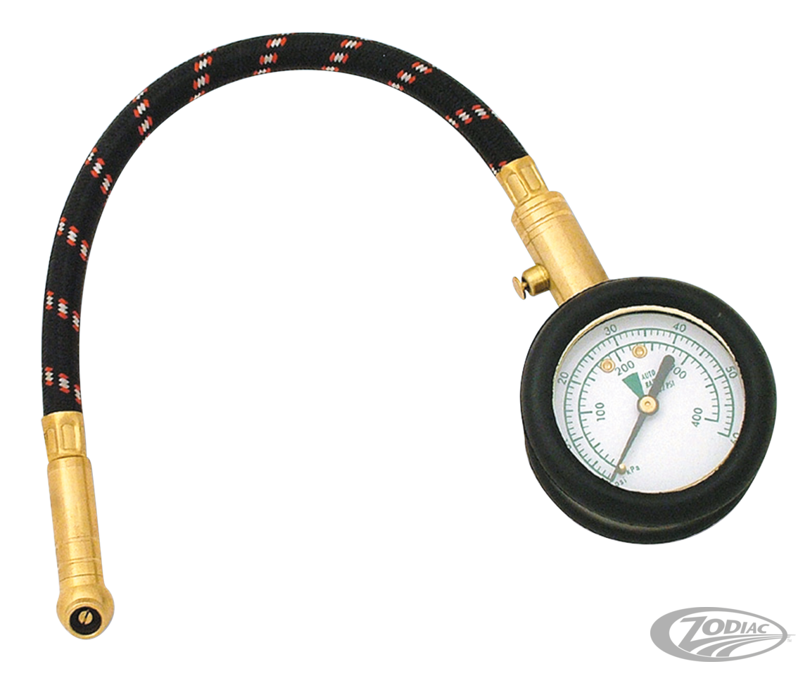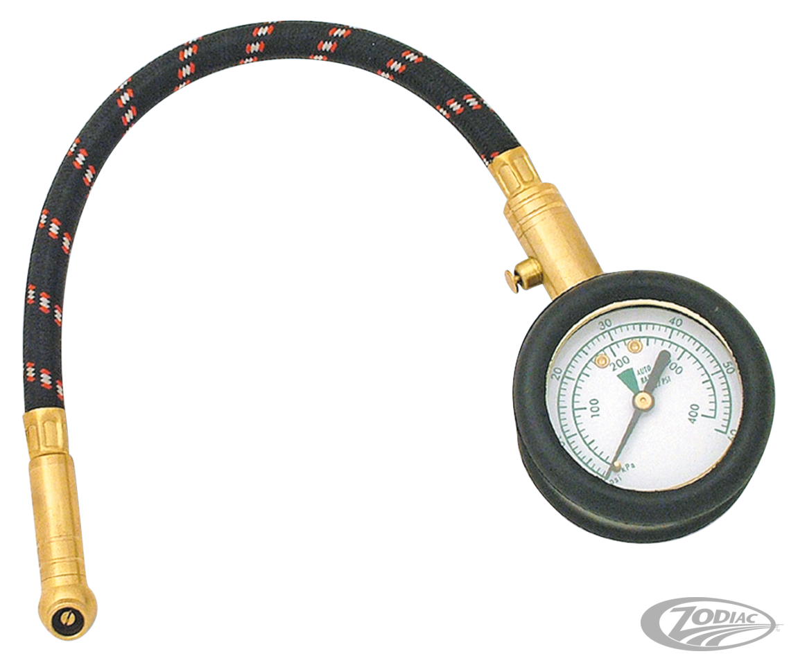 If you ever looked inside the toolbox of a mechanic, you would most likely find a tool like this precision tire pressure gauge. Not only does it provide quick and accurate readings, but also a valve holds the reading and allows bleeding of air until the desired pressure is reached. A 12" long flexible hose with a 40-degree brass chuck permits access to difficult places and every valve stem. The large 2" dial is very easy to read and is accurate over a 0-60PSI range.