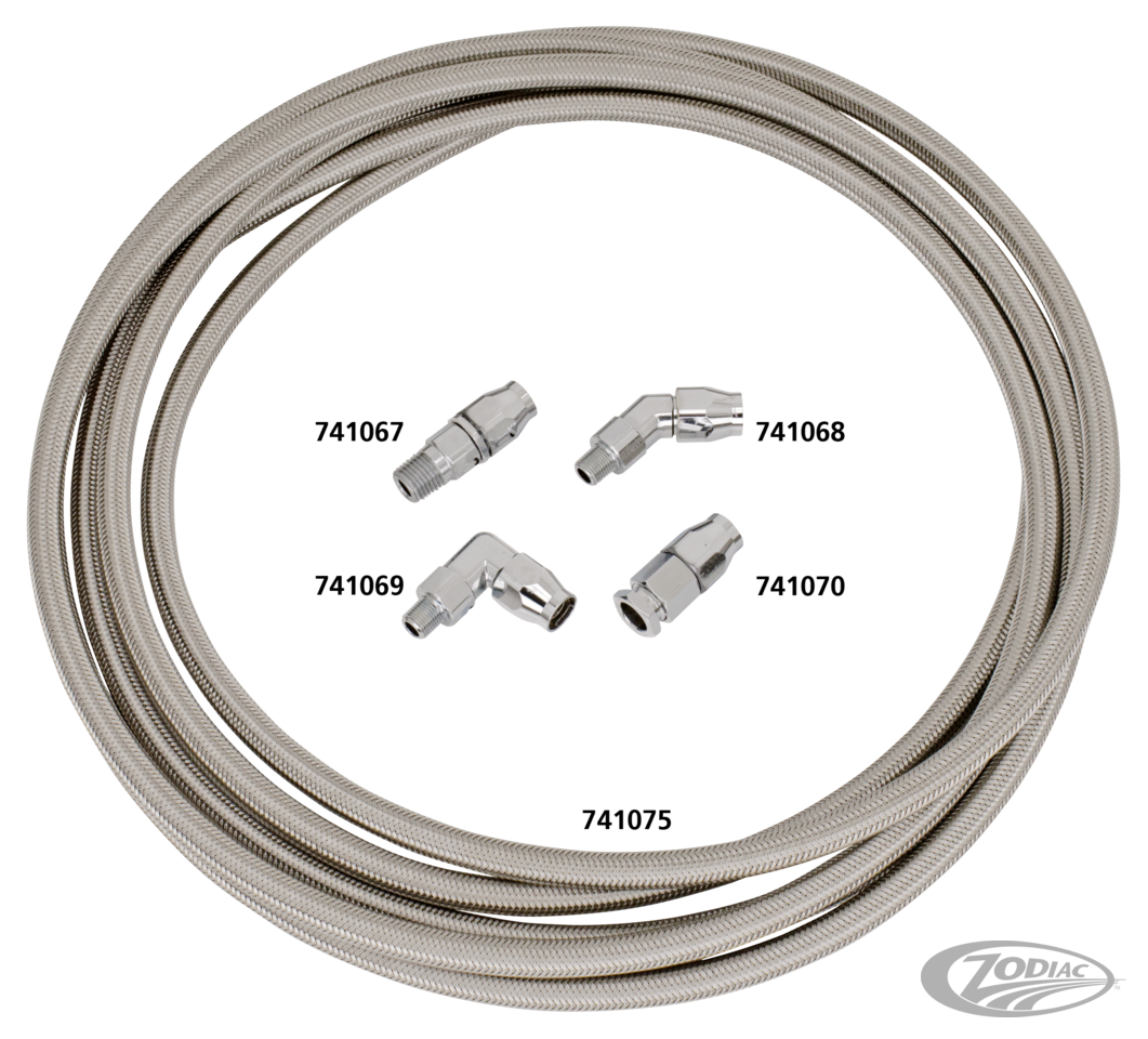 Teflon is compatible with all kinds of oils and chemicals and temperature resistant. Together with the corrosion and fire resistant braided stainless steel covering this Goodridge oil line provides aircraft quality with an 8.5mm (0.323") inner, and 11mm (0.439") outer diameter. Its clean looks make it ideal for use on motorcycles, and Goodridge's unique swivel-style oil line connectors make installation easier and cleaner than ever before, allowing you to create a reliable and extremely good looking oil line circuit. Lines can be made in any length desired, for use with or without oil cooler and are fully reusable. Oil line connectors are chrome plated.