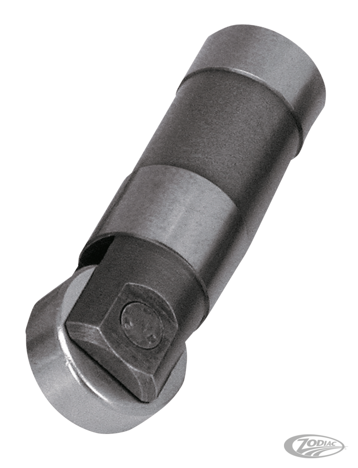 Developed exclusively for Zodiac by TP Developments and made from high grade alloy steel. These tappets are precision machined, than heat treated and finally ground to less than .0002" total readings at a 16 finish. They are called "Fat Axle" because they feature an extra thick roller pin and extra thick rollers for increased roll strength and will not deform, even when used with extreme high lift cams. Inside the tappet is a hydraulic cylinder which is also hardened and hand fit to .0002" using an air gauge. Strongly recommended when using a Performance cam as they give zero valve lash, and zero hydraulic collapse. These tappets are extremely competitive priced but still are the best money can buy. Fits Evolution Big Twin 1984-1999 and Evolution Sportster 1986-1990. Available in stock .8425" diameter and sold each.
