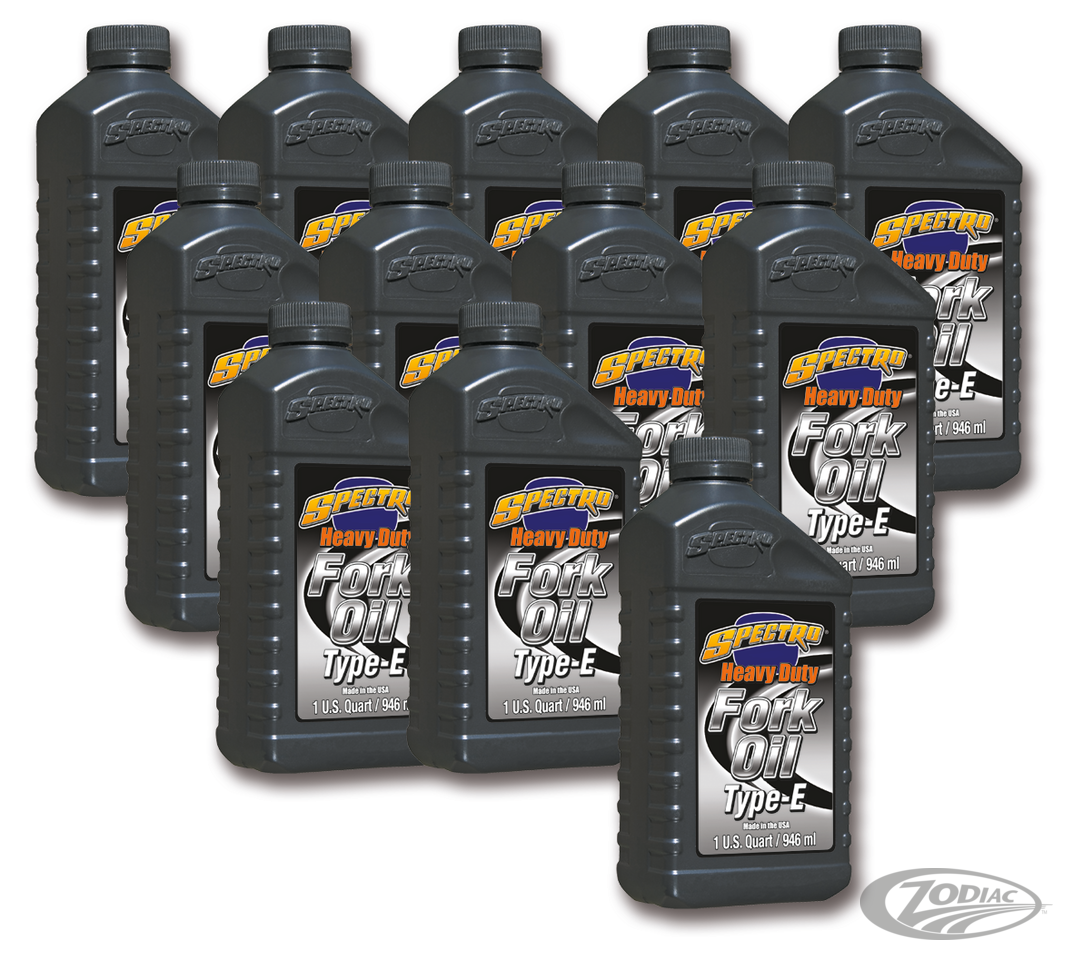Spectro's fork oils are premium quality and have a superior viscosity index to minimize viscosity loss due to heat build-up during riding even under the most severe conditions. This ensures superb performance over a wide range of operating temperatures. Available in Extra Light SAE 15W, Type-E SAE 20W20 (light) for normal road use and an extra Heavy Duty SAE 40 quality. The Heavy Duty quality meets or exceeds all Original Manufacturers specifications. Spectro fork oil dramatically reduce the sticking friction at the moment of direction change, provide superior seal conditioning and protection against rust and oxidation, resist thinning and fading, contents antifoaming additives and extend components life when used according to the owners manual. Sold in 1 quart cans (0.946L.) or 12 quarts per case.