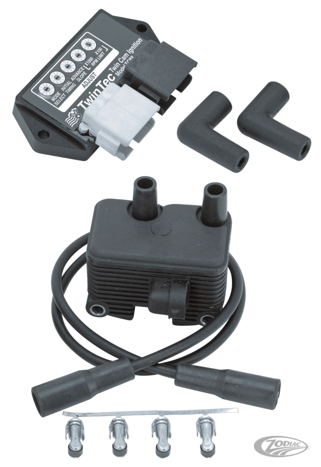 The Twin Tec TC88 module offers easy plug-in installation. All the switches are accessible from the top-a significant advantage for most installations. Five rotary switches are used to set the operating modes, adjust the initial timing and timing advance, and select the RPM limit. Since the TC88 engine uses a non-adjustable crankshaft position sensor, mechanical timing adjustments are no longer possible. The TC88 solves this problem with a switch for setting the initial timing. A second switch sets the slope of the advance curve. The combination of these two switches lets you optimize the timing advance for a wide range of applications-from stock to highly modified engines. An optional PC Link Interface Cable lets you upload custom advance curves. The TC88 communicates basic diagnostic information by blinking codes on the check engine LED. This eliminates the need for an expensive scan tool. For those that want a full upgrade of their ignition system we have a convenient kit available including module, coil, and plug wires.
