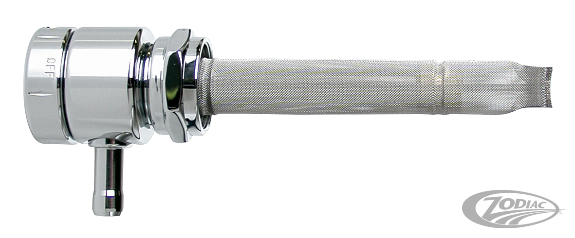 Featuring the same high flow body as the "Designer" petcock ZPN 236300. Although they have the same chromed body, this petcock is equipped with a round knob to control the ON, RESERVE and OFF positioning. Input via 22mm connector, including adapter nut. Output via 5/16" hose barb, left side.