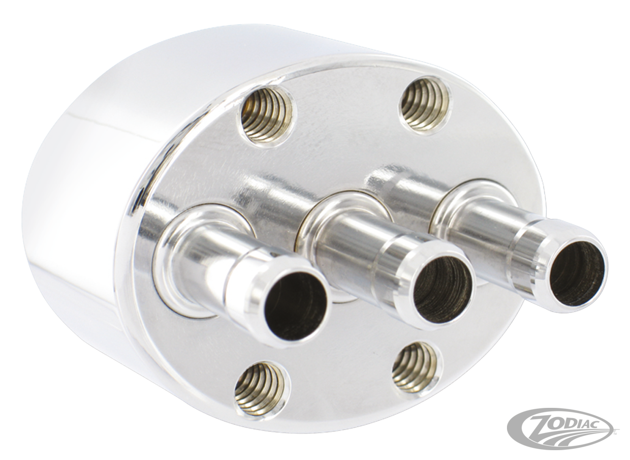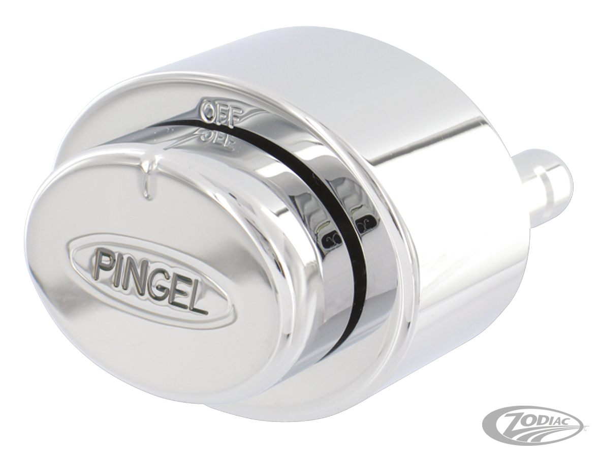 The Pingel Chopper Valve has been designed for use on motorcycles that have custom fuel tanks that are raised high in the front. This style of fuel tank usually does not allow proper fuel pick up when using a standard petcock with reserve position. Pingel's Chopper Valve allows the builder to keep the bottom of the tank clean from fuel lines. The custom builder now has universal options for mounting the fuel valve by utilizing the mounting holes on the back of the valve. This fuel valve has smooth clean lines featuring a compact design measuring 1 1/2" (38mm) high x 2" (51mm) long x 1 3/8" (35mm) deep. There is an easy to operate position selector knob with a ball detent for positive On-Off-Reserve locating. All hose barbs are 5/16". The Chopper Valve will require two hoses to be routed from the fuel tank-one for the ON position and one for the RESERVE position. The Chopper Valve is designed for exceptional fuel flow to feed the thirstiest of big inch engines. CNC machined from a solid piece of billet brass and finished with lustrous show quality chrome.