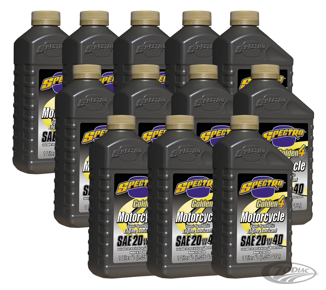 Golden Spectro is a super premium blended Semi-Synthetic lubricant. Exceeds all known motorcycle manufacturer's warranty requirements, plus A.P.I. SL/JASO MA/MA2. Smoother shifting, highest shear stability and exceptional endurance. This 20W-40 is great for use in both engine and transmission in all 1998 thru 2017 Victory and 2013 to present Indian motorcycles, except Indian Scout and Victory Octane. For these we recommend Spectro Platinum Full Synthetic SAE 15W-50.