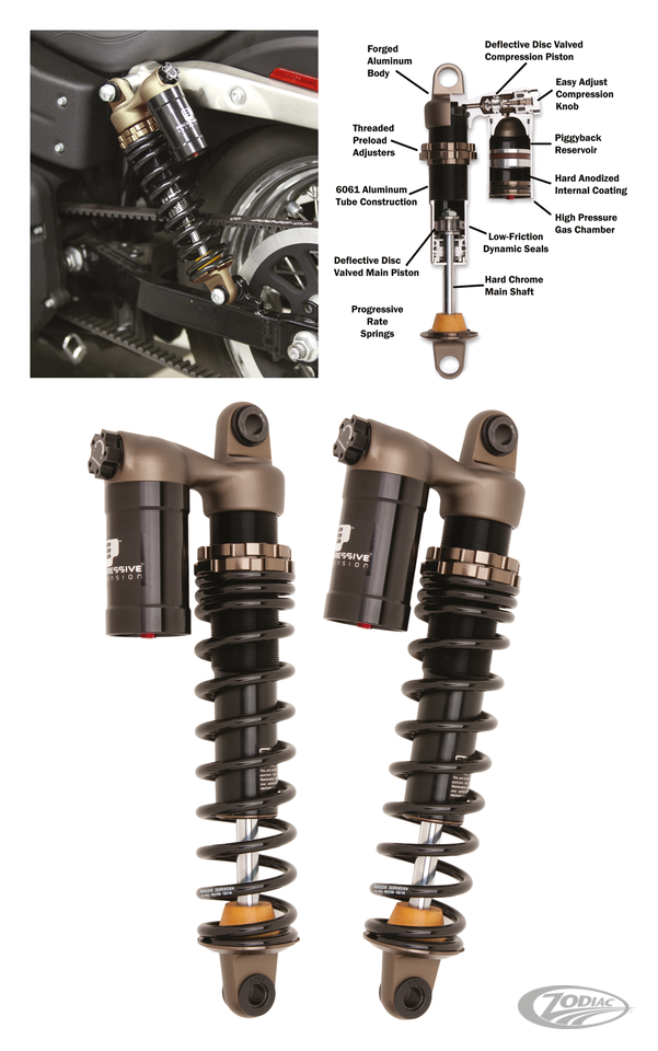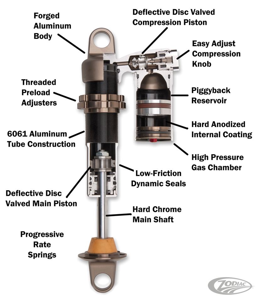 Inspired by racers, riders and those that demand more of their bikes than weekend coffee runs, the USA built 970 Series shocks combine a high pressure gas monotube design with deflective disc damping routed through two unique circuits and adjustable for compression damping via an easily accessible knob. The shock body and piggyback are internally coated to reduce friction. Features forged aluminum body, progressive rate springs with preload adjusters and hard chrome main shafts.
