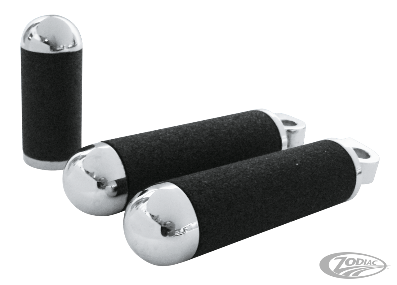 Paul Yaffe's exclusive top-secret urethane compound brings unparalleled pleasure to your ride. Perfect fit, perfect length, perfect feel. Feature removable end caps that make your handlebars a really cool place to stash your registration or whatever you feel like hiding. Handlebar grips fit all models with cable operated throttle 1982 to present, except those with handlebar air reservoirs. Matching Classic foot pegs and shifter pegs are also available.
