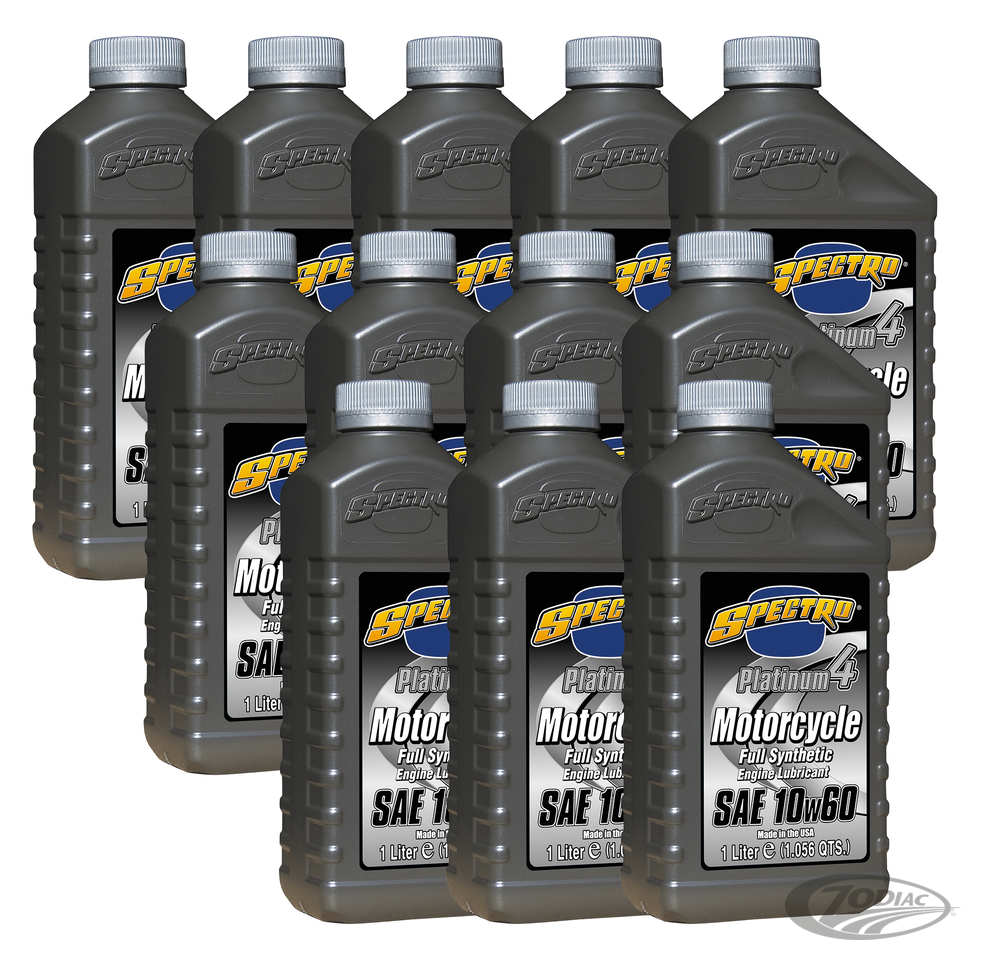 Spectro Platinum 4 Full Synthetic is the ultimate synthetic engine lubricant. Exceeds all known motorcycle manufacturer’s warranty requirements, plus A.P.I. SL/JASO MA/MA2. Smoother shifting, reduced friction, increased horsepower, highest shear stability. For street or track in, for example, Indian Scout and FTR1200.