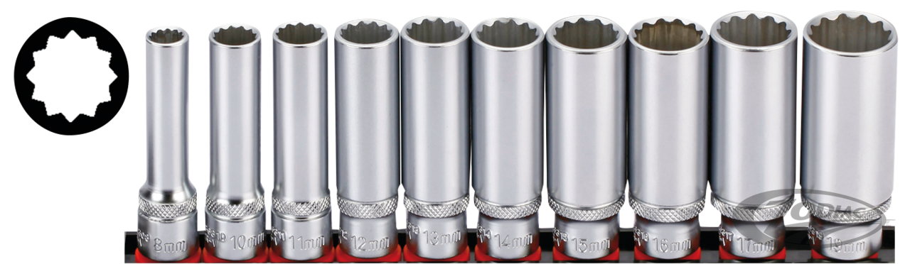 3/8" drive 10-piece 12-point flank metric deep socket set; 8, 10, 12, 13, 14, 15, 16, 17 & 19mm