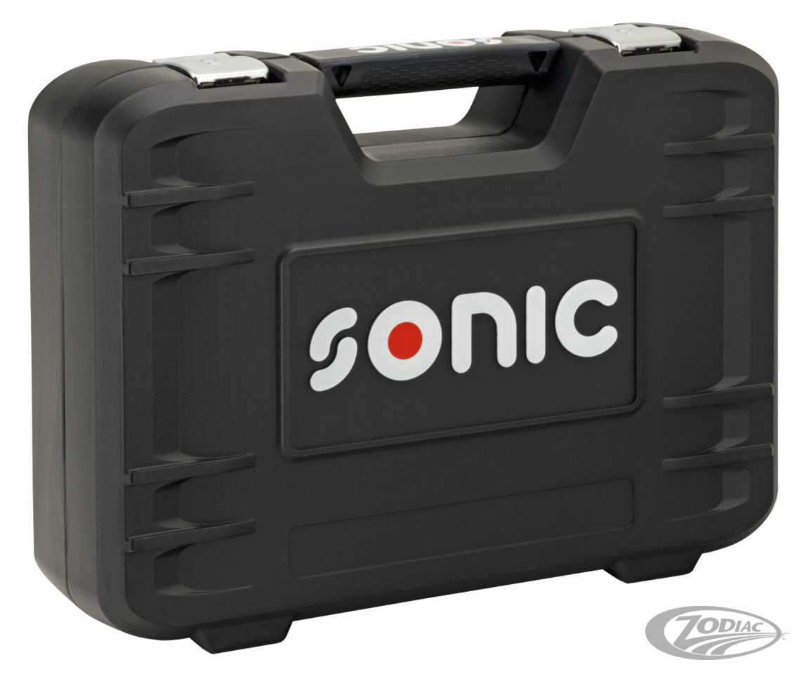 Professional tools packed in tough plastic organizers with ratchets, extensions and swivel end.