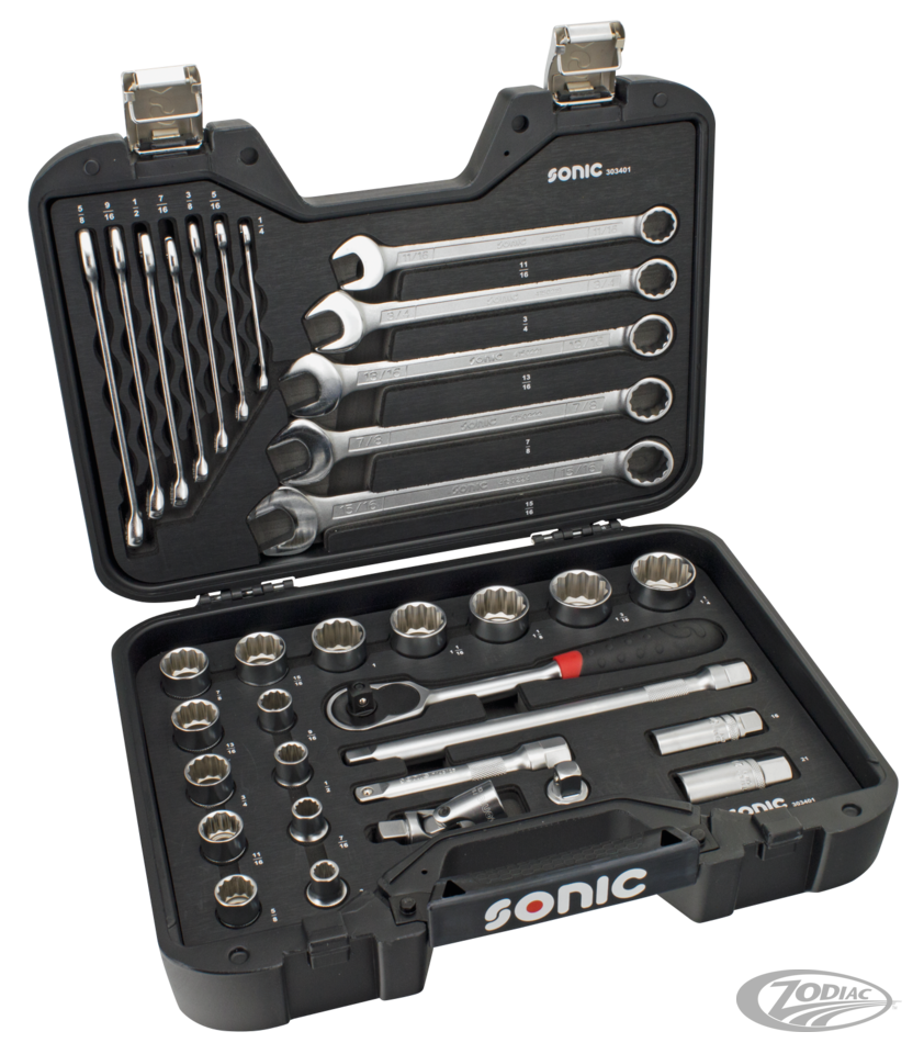 34-Piece inch size set, 1/2" drive, 3/8" thru 1 1/4" 12-point sockets, spark plug sockets and 1/4" thru 15/16" box and open end combination spanners