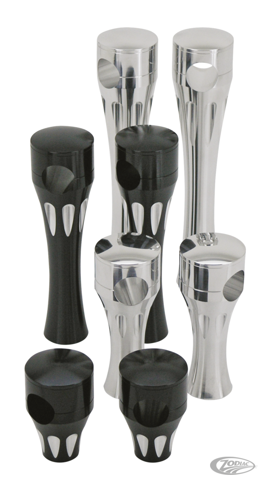 These slotted riser sets for one inch diameter handelbars are CNC machined from solid aluminum by Ken's Factory. They feature top end caps to keep the top mounting bolts out of sight and take ZPN 233383 1/2-13x2" UNC riser bolts. Risers are sold in pairs.