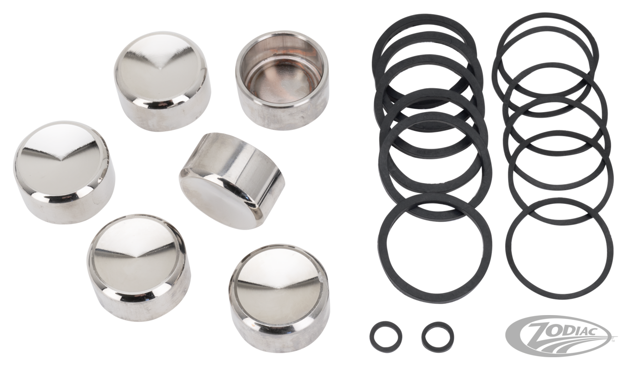 Fits FLHTCUTG Tri Glide Ultra Classic 2014-2018 and FLRT Freewheeler 2015-2018, Kit with six pistons and seals for stock calipers