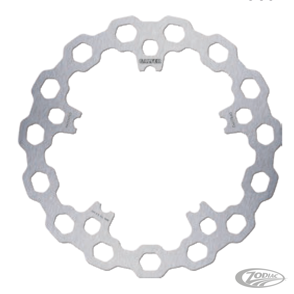 Fits front on V-Rod 2006-2017, Dyna 2006-2017, FLHRSE4 CVO Road King 2008 & FLTRSE3 CVO Road Glide 2009Spoke mounted disc has 11.8" (300mm) outer diameter, 6.77" (172mm) inner diameter and five special shape mounting holes, Cubiq design disc, stock "Semi-Floater" mount