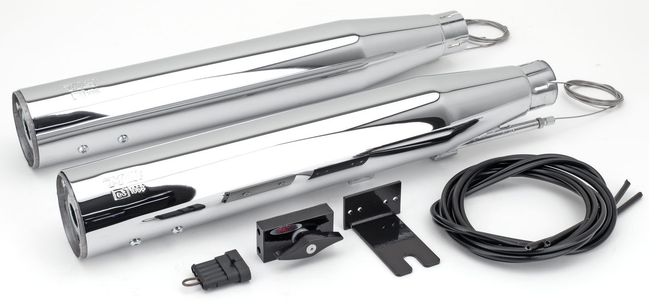 E-approved slip-ons with an adjustable exhaust valve that allows you to tune the sound of your bike the way you like it, but still get back to what is legal. These exhausts come complete with a manual operated adjusting lever that can be placed on either the handlebar or below the tank. Electric operated adjusting motors with a key fob style remote control are available as an option. Muffler end caps must be ordered separately.