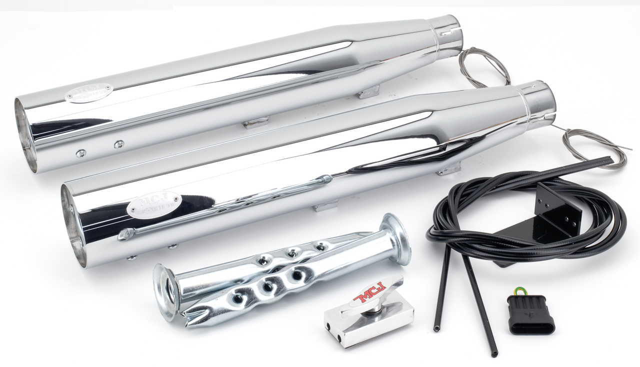 E-approved slip-ons with an adjustable exhaust valve that allows you to tune the sound of your bike the way you like it, but still get back to what is legal. These exhausts come complete with a manual operated adjusting lever that can be placed on either the handlebar or below the tank. Electric operated adjusting motors with a key fob style remote control are available as an option. Muffler end caps must be ordered separately.