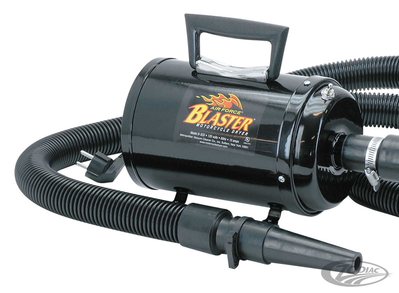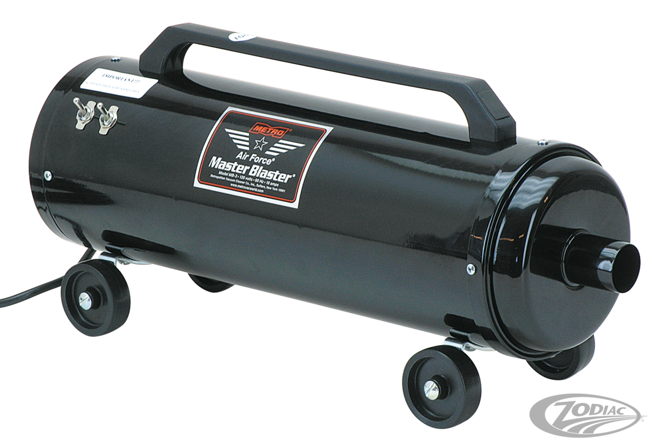 The Metro Air Force Blaster motorcycle dryers are specifically designed for cleaning and drying motorcycles with dry, filtered air that is about 20-25 degrees above the ambient temperature. The Air Force Blaster is the quickest and most efficient method to dry motorcycles thoroughly and eliminates water spots, it will cut cleaning time by 80%. Five to seven minutes is all it takes to quickly and effectively dry motorcycles. No more water spots or stains, no more leaf blowers, no more compressors, just a lot of more time to ride. The Blaster is completely safe for all paint and chrome finishes. Air Force Blasters are available in three versions a 1.5 HP side kick, a 4.0 HP version for personal use, and a 8.0 HP version for professional use and those who do not want to lose a second drying their bike. The Metro Blaster SideKick is a handheld companion to the larger Metro Air Force Blaster. The SideKick is perfect for someone looking for a compact, affordable, effective way of drying a motorcycle quickly. People who already own the Air Force Blaster will find the SideKick is a great substitute when traveling. The Metro Blaster SideKick has all the features that you could ask for in a compact dryer: it is lightweight, portable and convenient. Features: •85CFM (2400L. per minute) Air Volume •200 MPH (320 KM/H) air speed •1.3 HP Motor •8 Amp, 240 Volts, 950 Watt •12 feet (3.66 meter) long grounded cord. •2 nozzles included The 4.0 HP version features •4.0 Peak Horsepower (29,000 FPM) Motor •Rugged all Steel Construction •10 Foot (4.5 meter) Heavy Duty Hose •Heavy Duty Neoprene Blower Nozzle •5 Piece Attachment Kit For the 4.0 HP version there is also an accessories package including a wall/table bracket, 10 feet (3 meter) hose extension kit and a carrying case available. The 8.0 HP AirForce Master Blaster This Motorcycle Dryer features a total of 8 peak horsepower. Two twin-fan, 4.0 Peak horsepower motors that deliver up to 58,500 feet per minute of clean, filtered, warm airflow. Two switches allow users to set the airflow and temperature at 3 different levels. Use either motor (front or rear) independently or both simultaneously for maximum power. Five different nozzles enable users to position airflow where desired and eliminate water spots. Features: •8 Peak Horsepower Dryer unit on wheels with 12 foot (3.65 meter) cord •Rugged all Steel Construction •10-Foot Heavy Duty Hose •Heavy Duty Neoprene Blower •NozzleAir concentrator •Air streamer tool •Micro adapter •Male/male adapter •5 Piece Attachment Kit